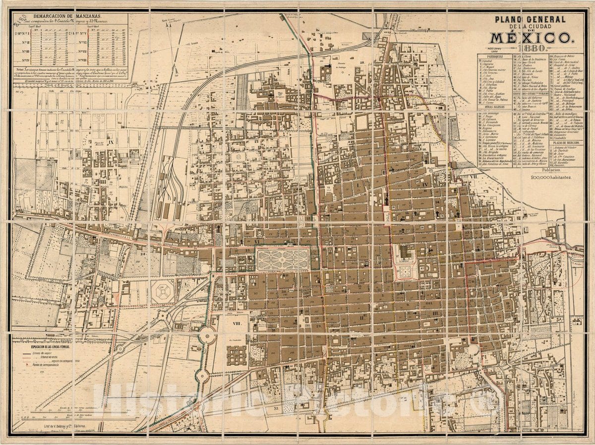 Map : Mexico City, Mexico 1880, Plano general de la Ciudad de Me?xico,1880. , Antique Vintage Reproduction