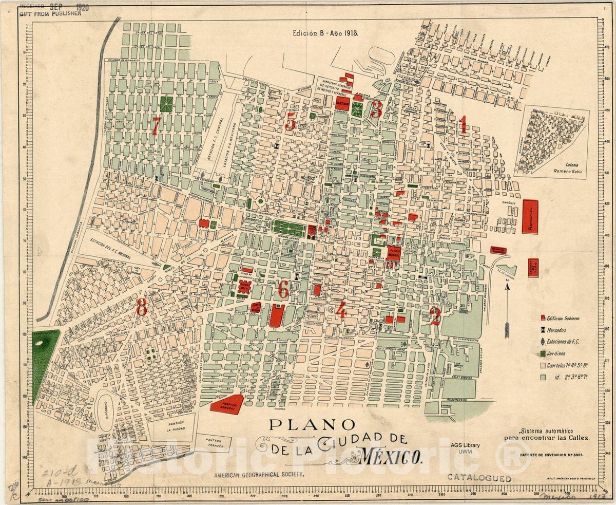 Map : Mexico City, Mexico 1913, Plano de la Ciudad de Me?xico, Antique Vintage Reproduction