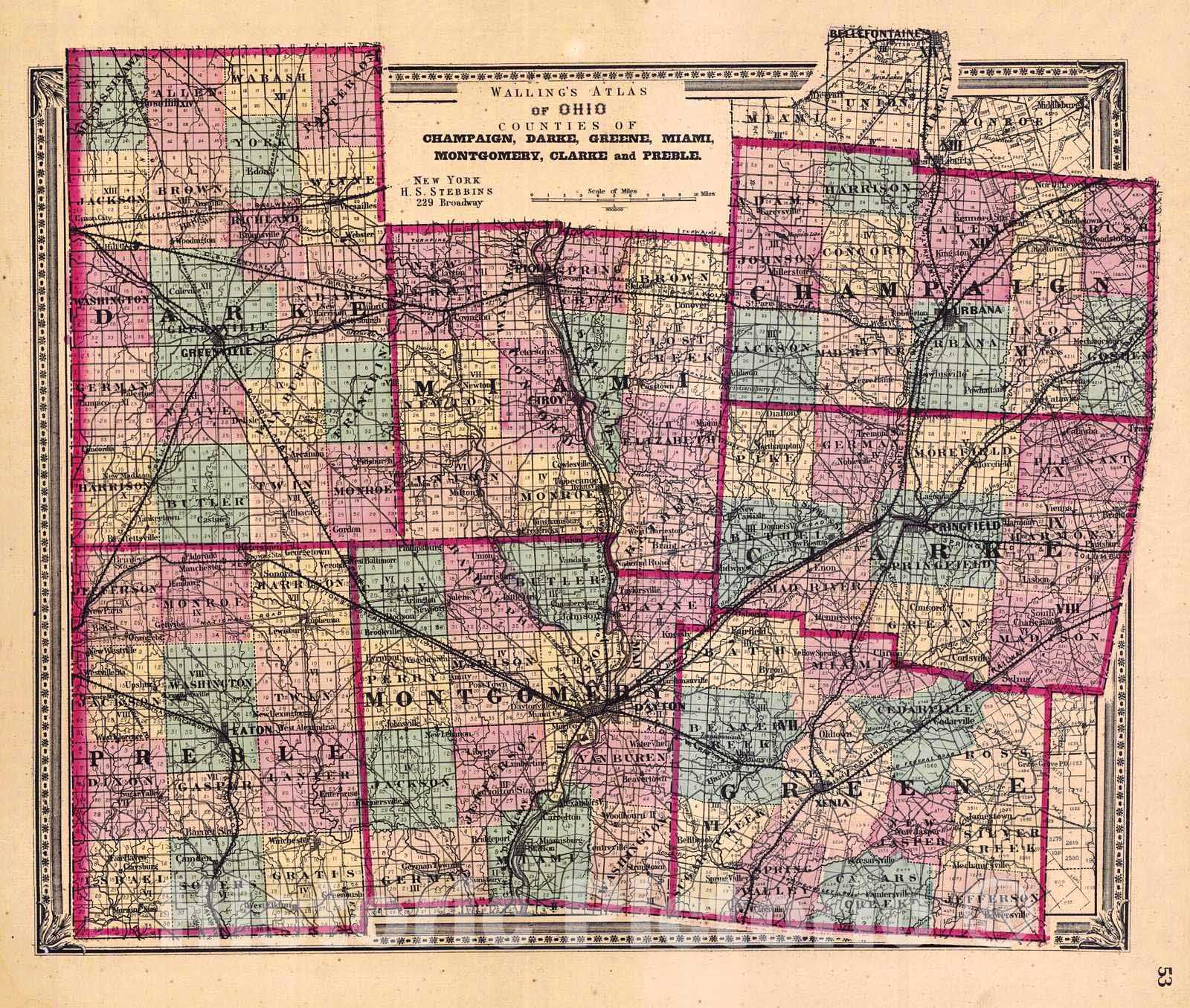 Historic Map : 1868 Walling Atlas of Ohio Counties of Champaign, Darke, Greene, Miami, Montgomery, Clarke, and Preble : Vintage Wall Art
