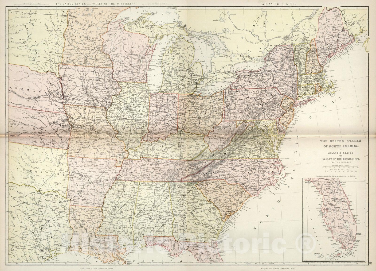 Historic Map : Composite Map: The United States of North America. Atlantic States and Valley of the Mississippi, 1882 - Vintage Wall Art