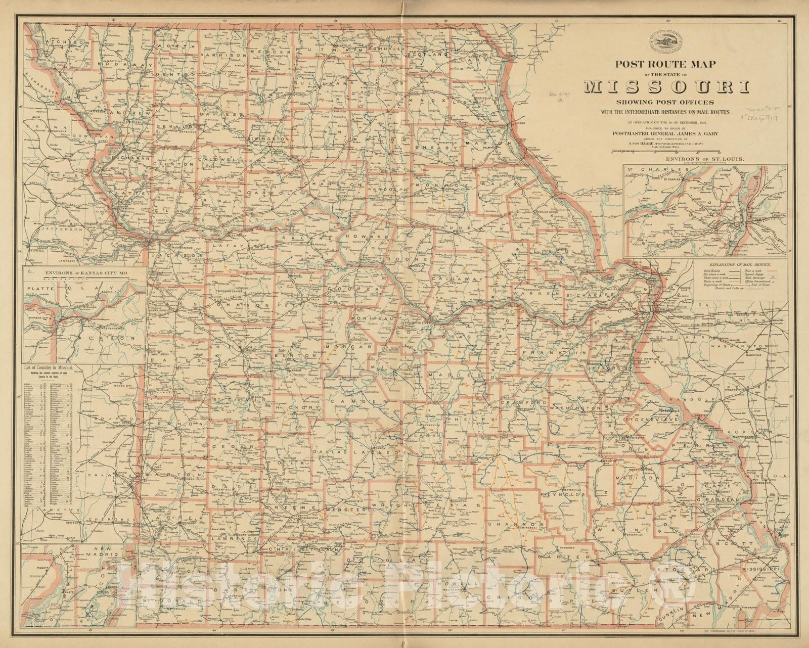 Historical Map, Post Route map of The State of Missouri Showing Post Offices with The Intermediate Distances on Mail Routes in Operation on The 1st. of December, 1897, Vintage Wall Art
