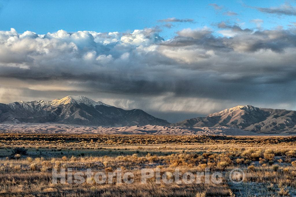 Photo- Distant view of Great Sand Dunes National Park & Preserve (the brownish hills of sand below the Sangre de Cristo Mountain Range) in south-central Colorado's Alamosa County