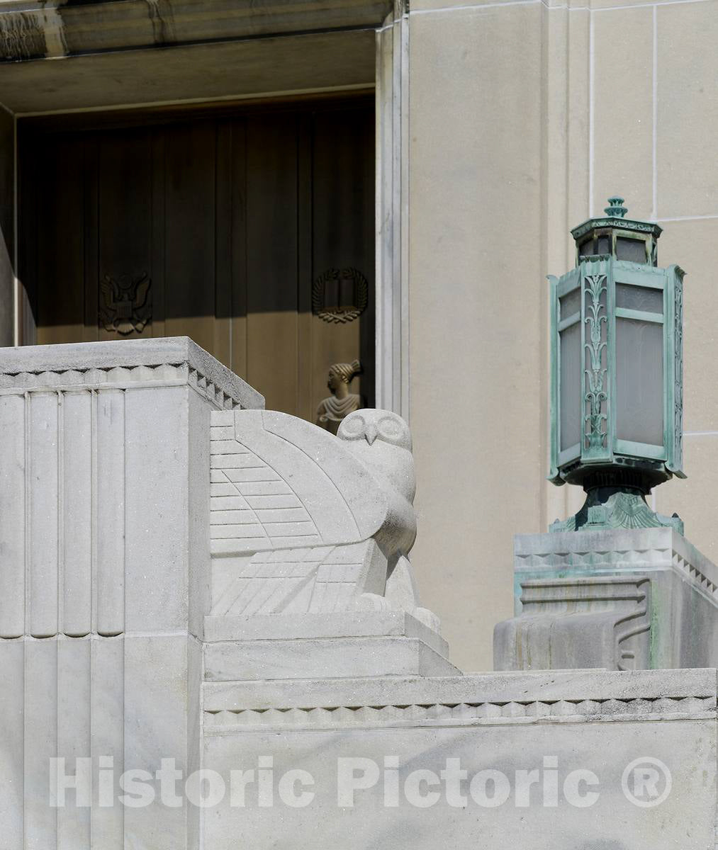 • .Photo- Exterior View. South Entrance (Independence Avenue), Sculpted Stairway with Stylized owl and Elaborate lamp. Library of Congress John Adams Building, Washington, D.C.