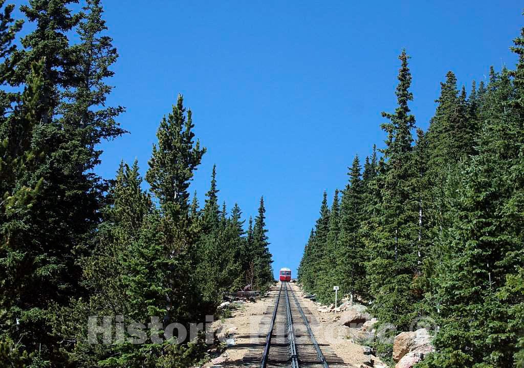 Photo- On the up and up (and up) for the Pikes Peak Cog Railway, which ascends Colorado's famous 14,115-foot Pikes Peak from its base station far below in Manitou Springs