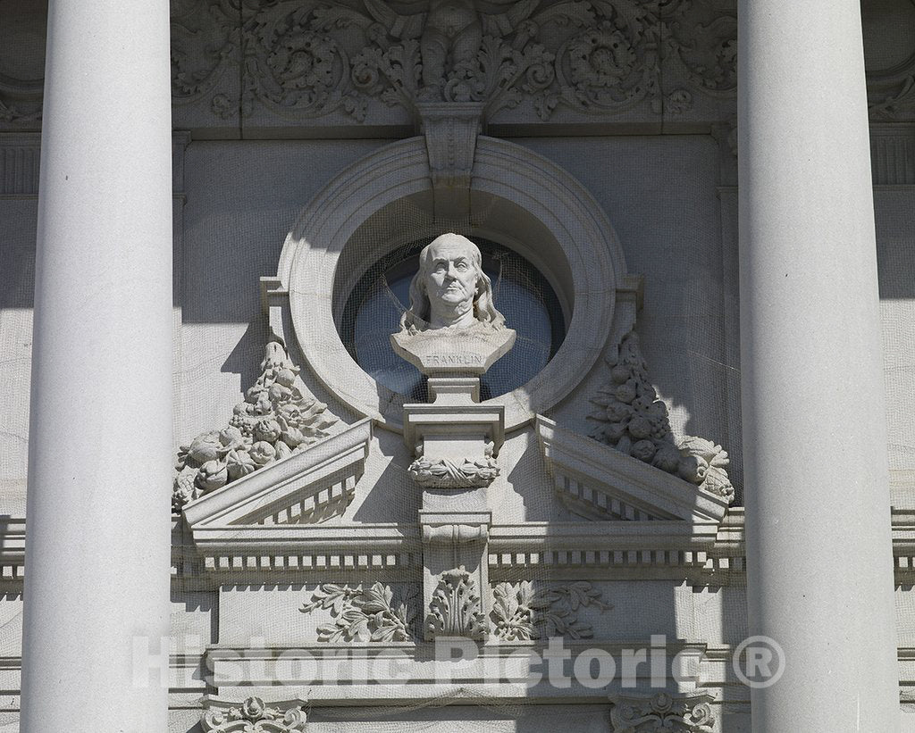 Washington, (D.C.) Photograph - Exterior View. Bust of Benjamin Franklin by F. Wellington Ruckstull, west façade. Library of Congress Thomas Jefferson Building, Washington, D.C.