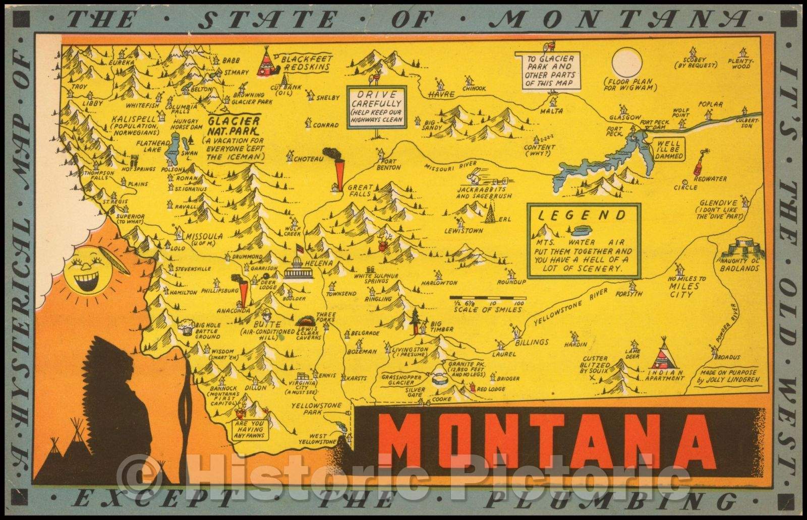 A Hysterical Map Of The State of Montana. Its The Old West Except The Plumbing, 1948, Lindgren Brothers