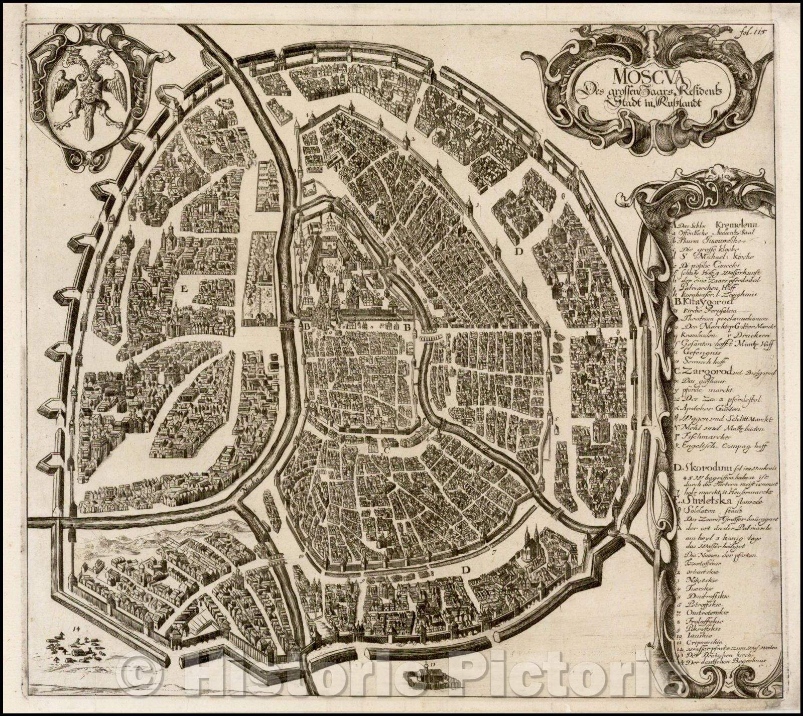 Historic Map - Moscva des Grossen Zaars Residenz Stadt in Russlandt/Bird's eye of Moscow, 1647, Adam Olearius - Vintage Wall Art