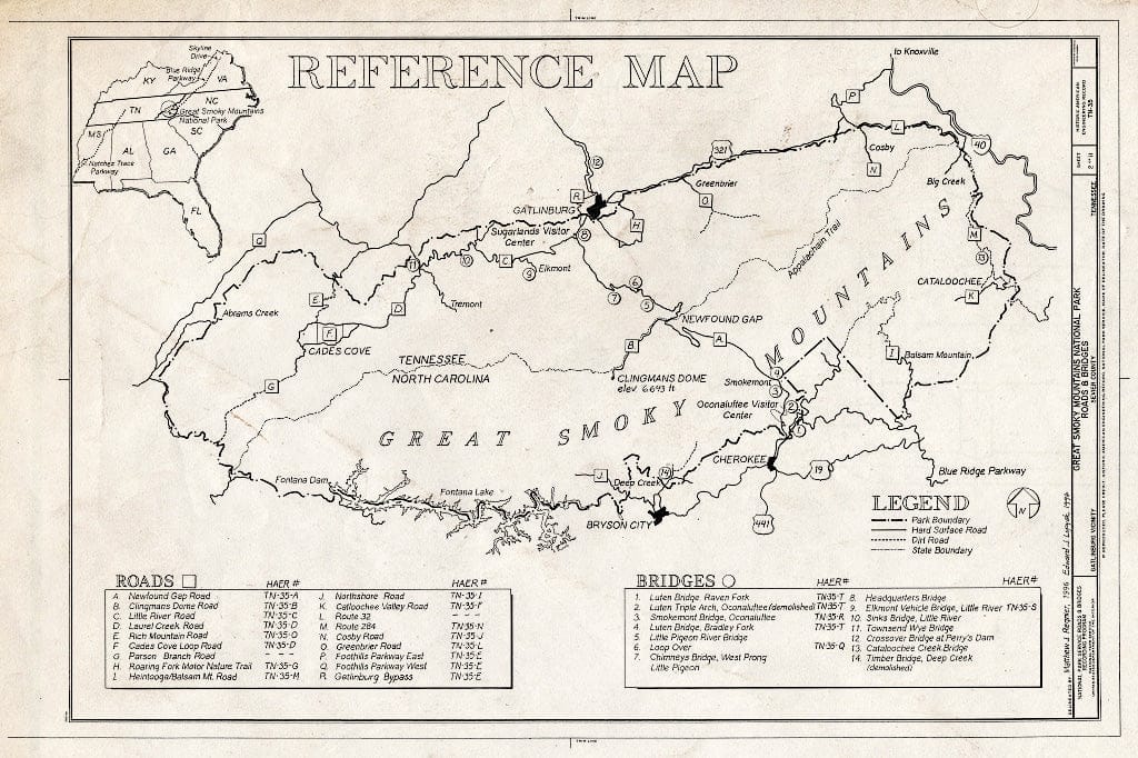 Blueprint Reference Map - Great Smoky Mountains National Park Roads & Bridges, Gatlinburg, Sevier County, TN