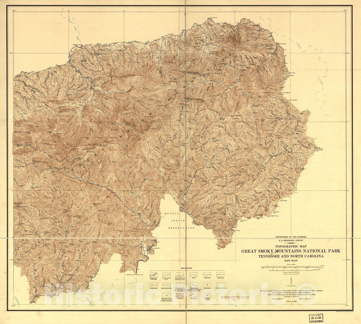 • .Historic 1934 Map - Topographic map, Great Smoky Mountains National Park, Tennessee and North Carolina.