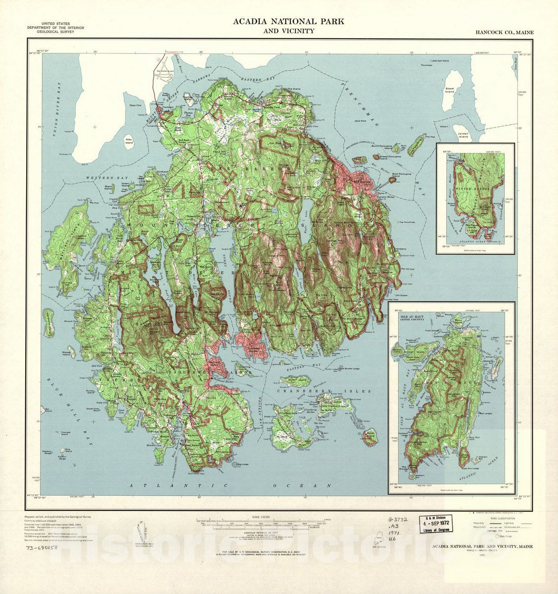 Historic 1972 Map - Acadia National Park and Vicinity, Hancock Co, Maine.
