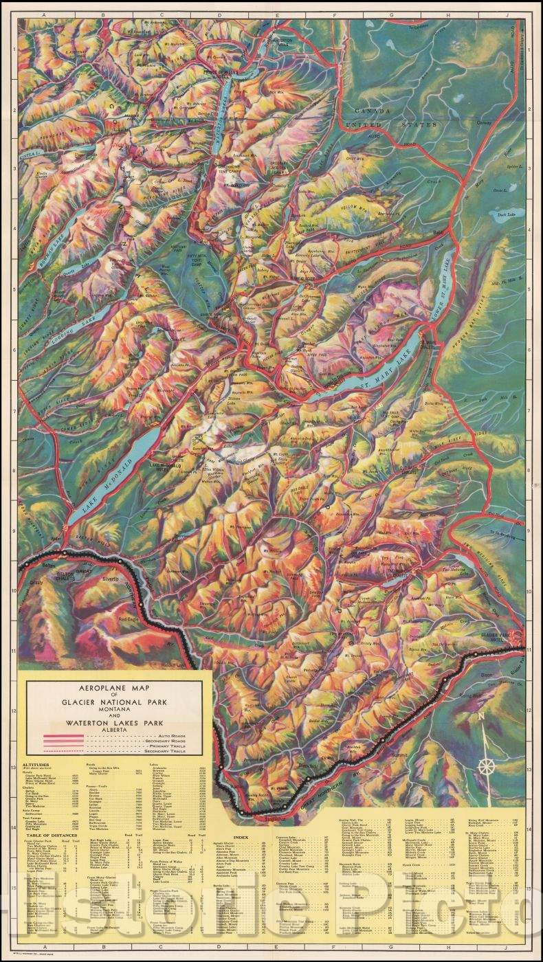 • .Historic Map - Aeroplane View of Glacier National Park Montana and Waterton Lakes Park Alberta, 1936, McGill-Warner Co. - Vintage Wall Art