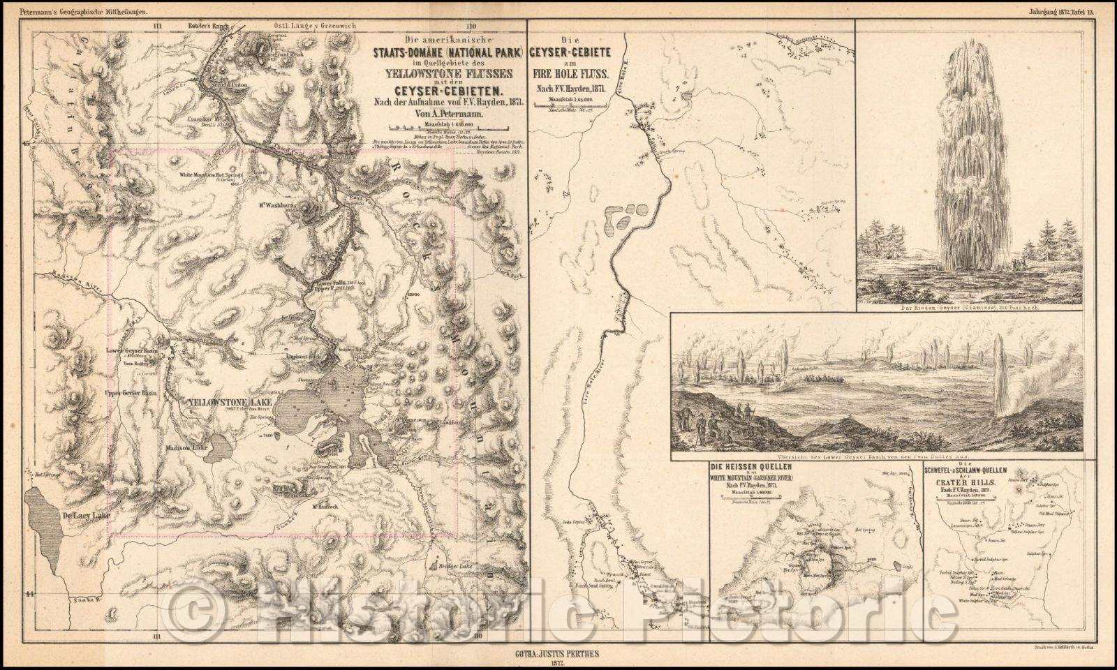 Historic Map - Die amerikanische Staats-Domane National Park im Quellgebiete des Yellowstone Flusses mit den Geyser-Gebieten Nach der Aufnahme, 1872 - Vintage Wall Art