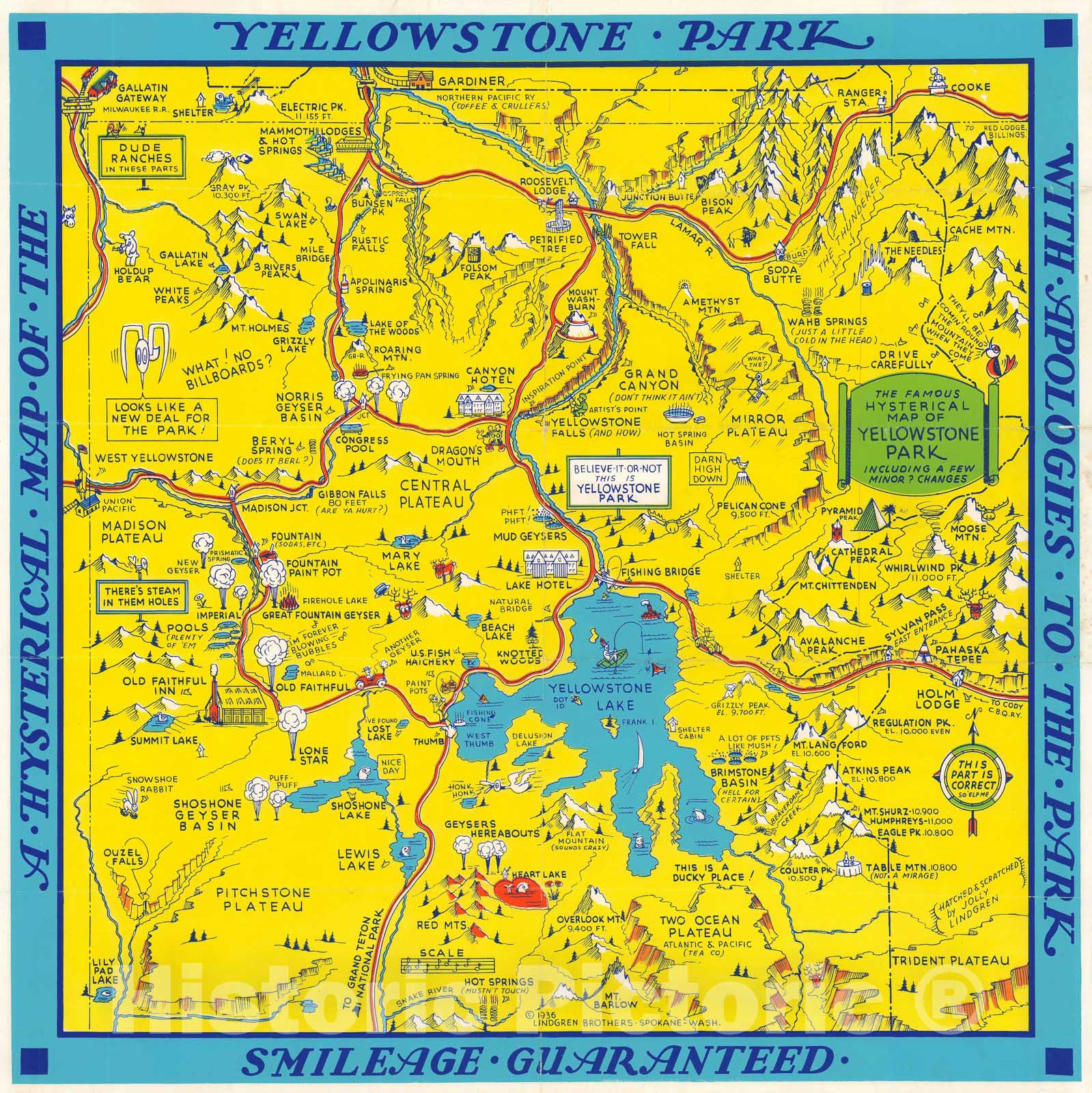 Historic Map : Humerous Pictorial of Yellowstone National Park, Lindgren, 1936, Vintage Wall Art