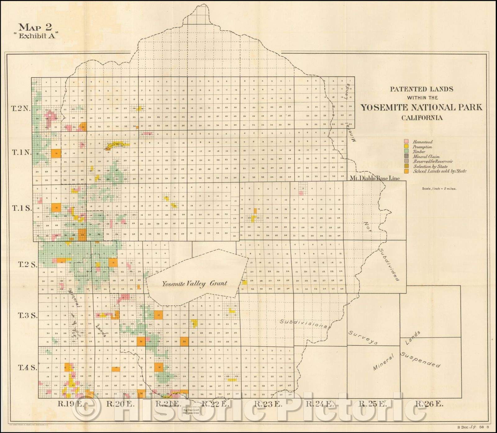 • .Historic Map - Patented Lands within the Yosemite National Park California, 1904, Norris Peters Co. - Vintage Wall Art