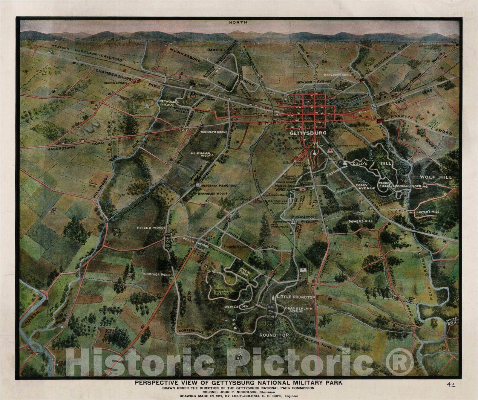 Historic Map : Perspective View of Gettysburg National Military Park Drawn Under The Direction of the Gettysburg National Park Commission, 1919., 1919, , Vintage Wall Art
