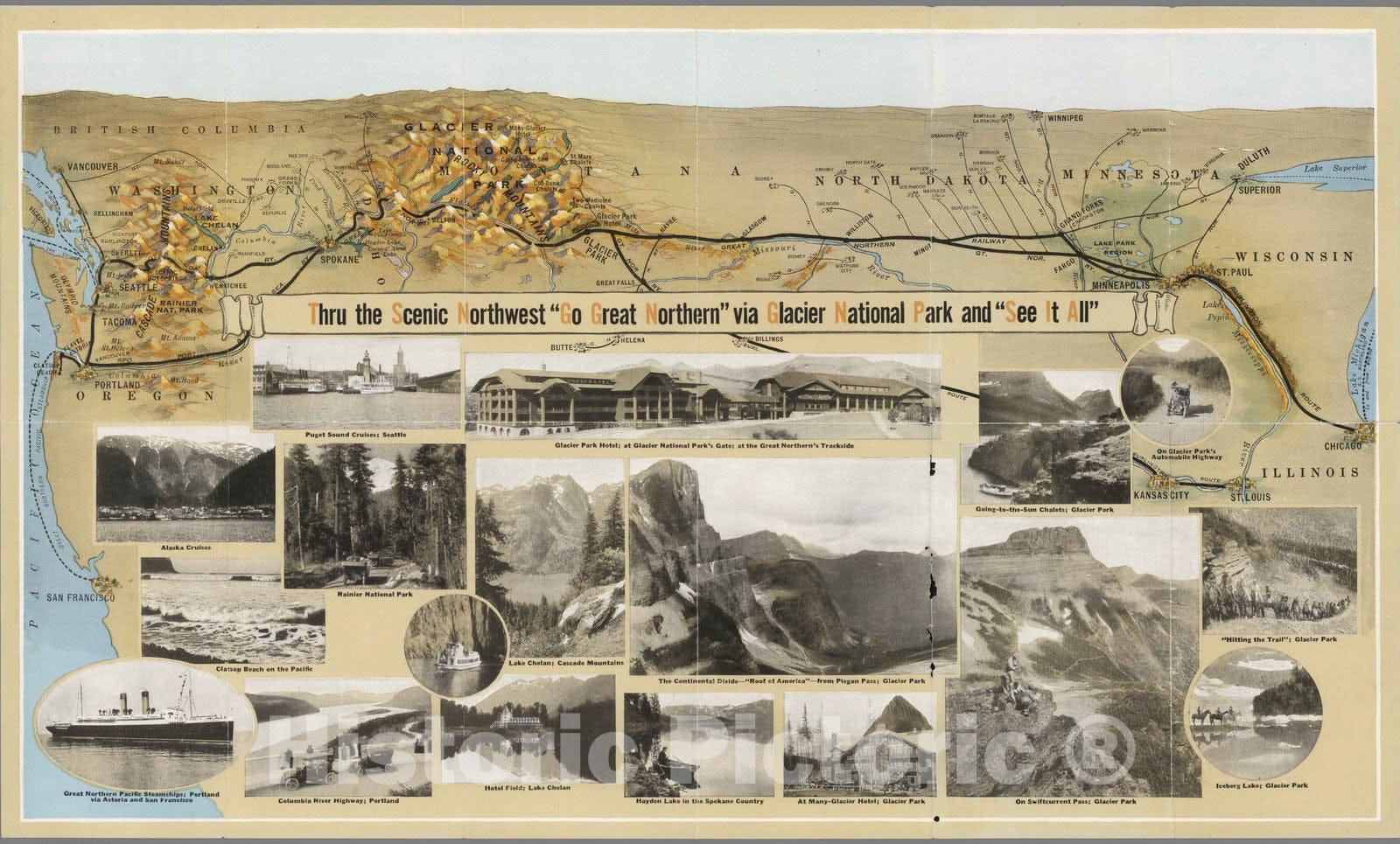 • Historic Map : Thru the Scenic Northwest Go Great Northern via Glacier National Park and See It All. 1925 - Vintage Wall Art