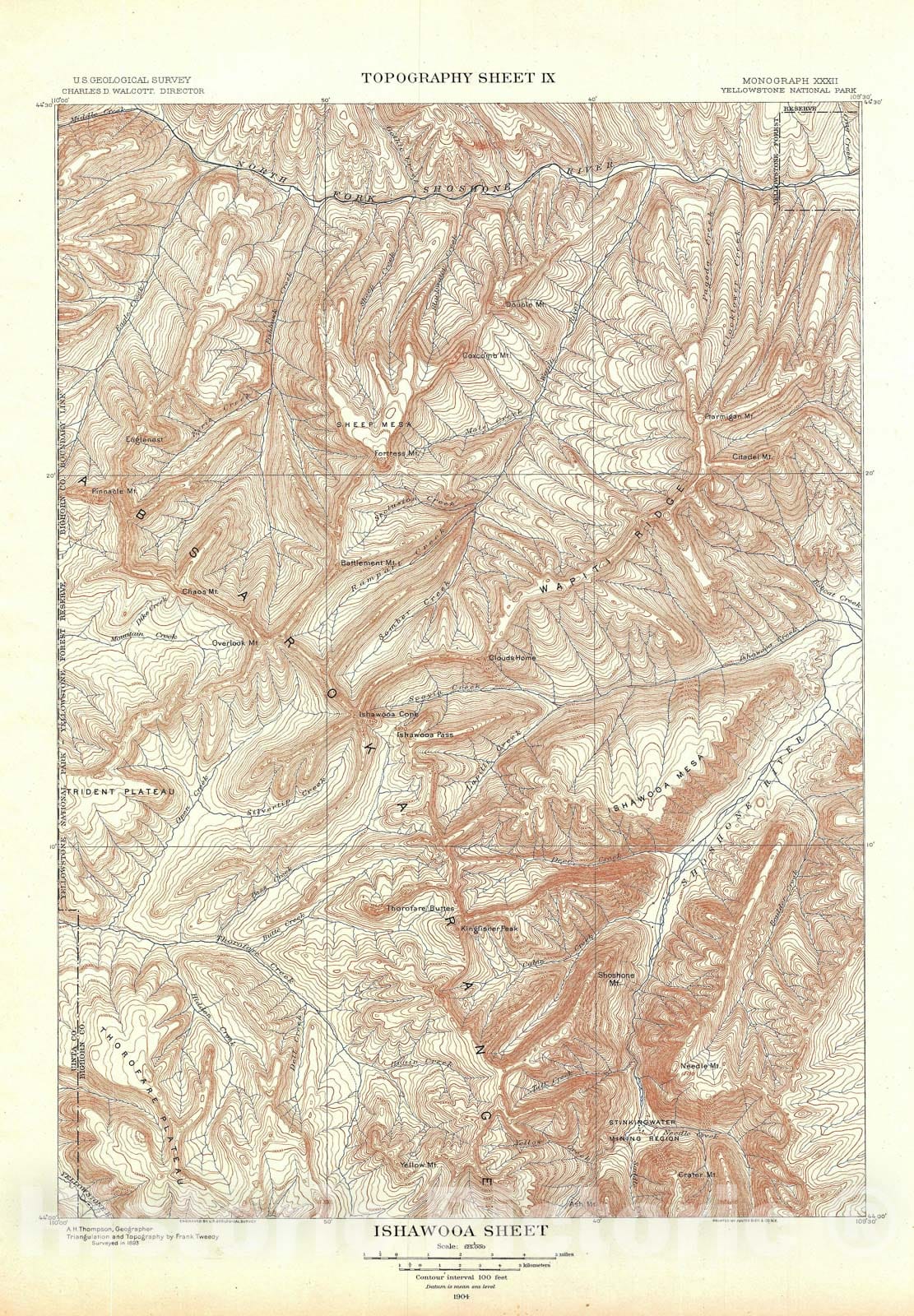 Historic Map : USGS Topographic Ishawooa, Yellowstone National Park, 1904, Vintage Wall Art