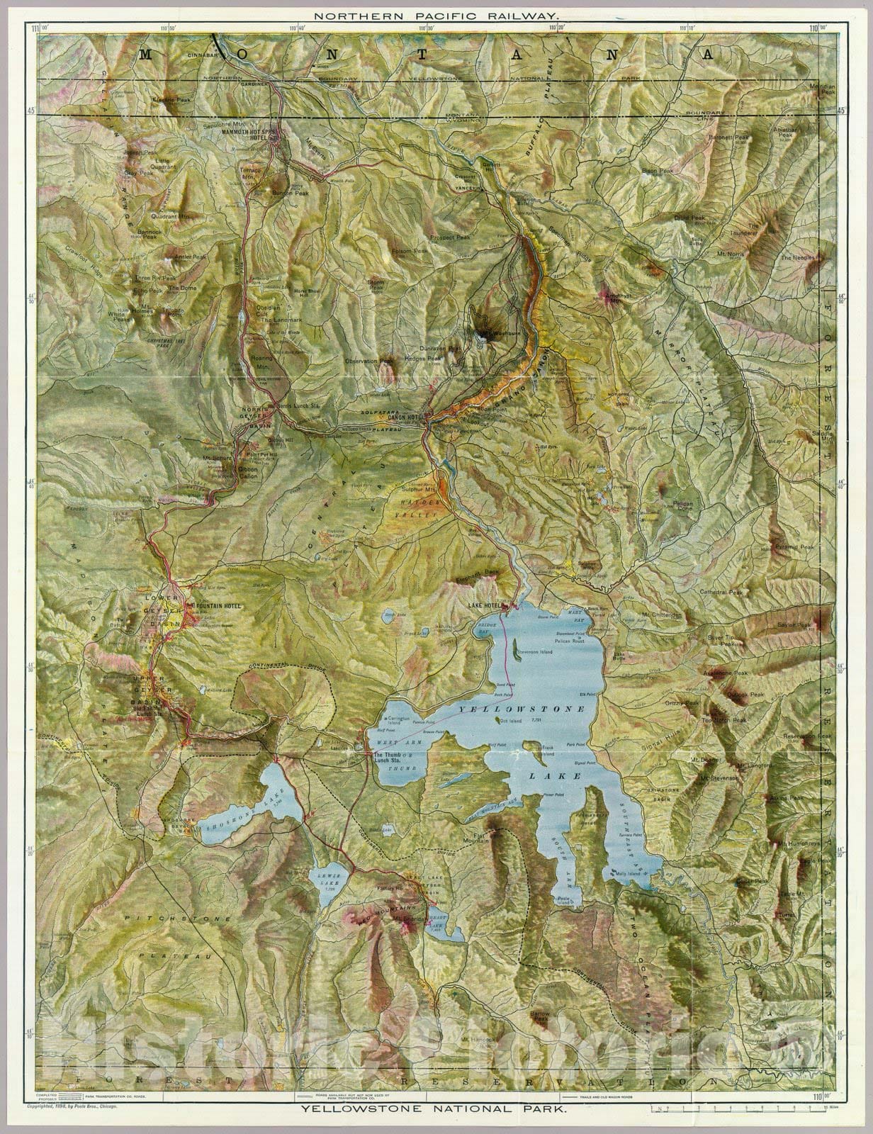 Yellowstone National Park. Northern Pacific Railway. Poole Bros., Chicago. Copyrighted, 1898, by Poole Bros., Chicago. | The Yellowstone National Park via Northern Pacific Railway. Northern Pacific, Yellowstone Park Line. Puget Sound and Alaska. (map on verso) Northern Pacific Railway. Yellowstone National Park. Copyrighted, 1898, by Poole Bros., Chicago. Poole Bros., Chicago. | On one side of this brochure is a large full color birdseye view of Yellowstone National Park. The view is the same as that appearing in the brochure of the Burlington Route, 1898. On the verso are two maps, one showing the Northern Pacific route from Duluth and Minneapolis west to Tacoma, the other showing steamship routes to Alaska from Puget Sound, plus the usual photos and text regarding Yellowstone and Alaska. Folded into self wrappers 23 x 11. Timetable comes in envelope with return address "From Yellowstone National Park on the Northern Pacific Railway" and shows a view of "Mammoth Hot Springs Hotel".