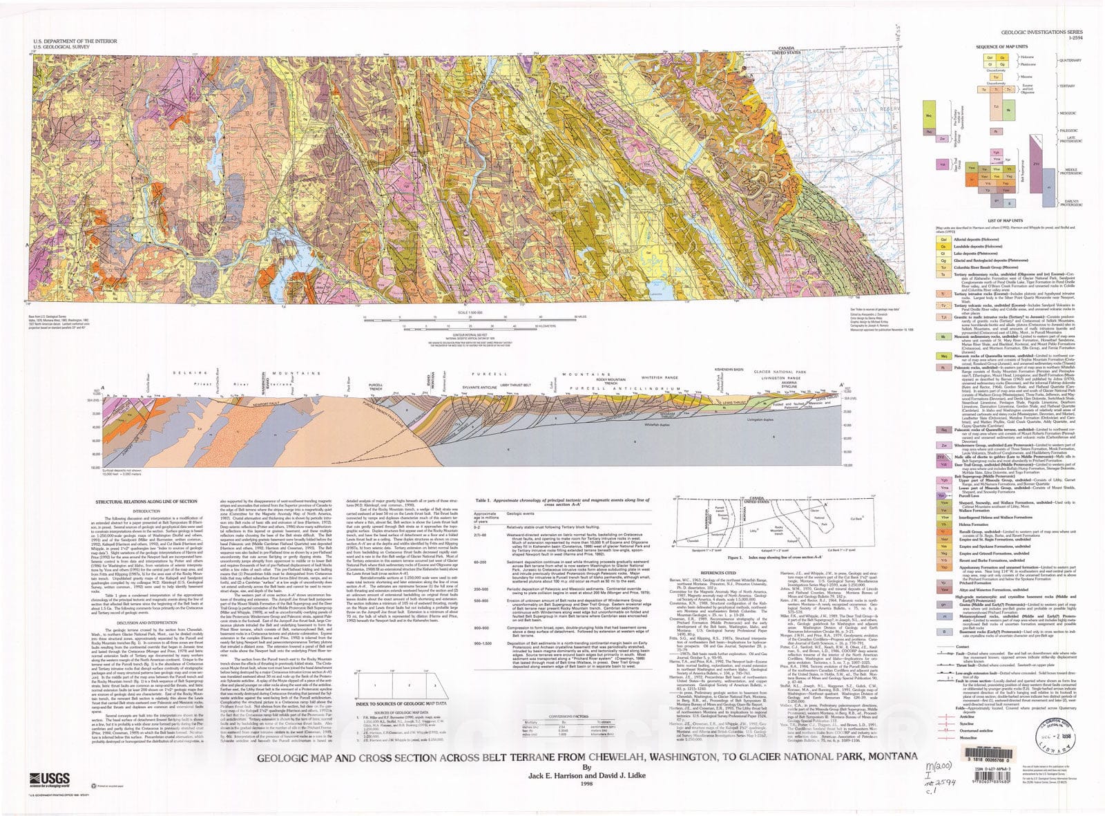 Map : Geologic map and cross section across Belt terrane from Chewelah, Washington, to Glacier National Park, Montana, 1998 Cartography Wall Art :