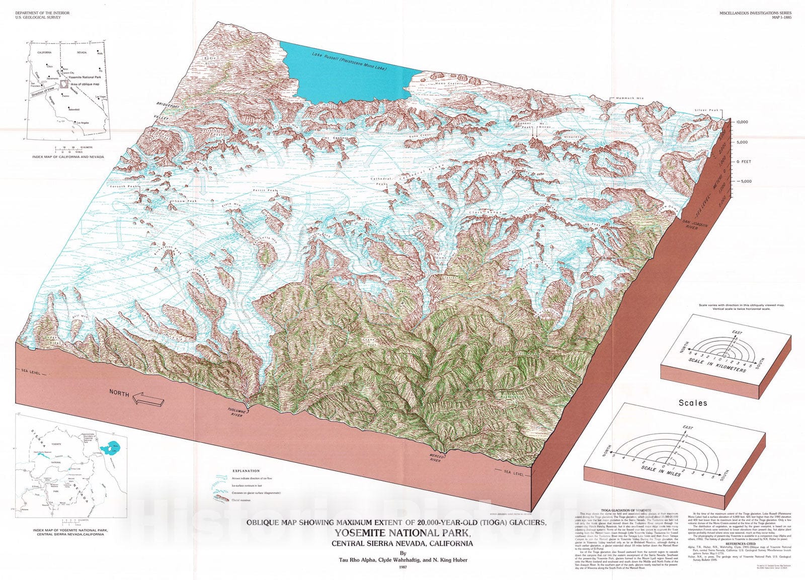 Map : Oblique map showing maximum extent of 20,000-year-old (Tioga) glaciers, Yosemite National Park, central Sierra Nevada, California, 1987 Cartography Wall Art :