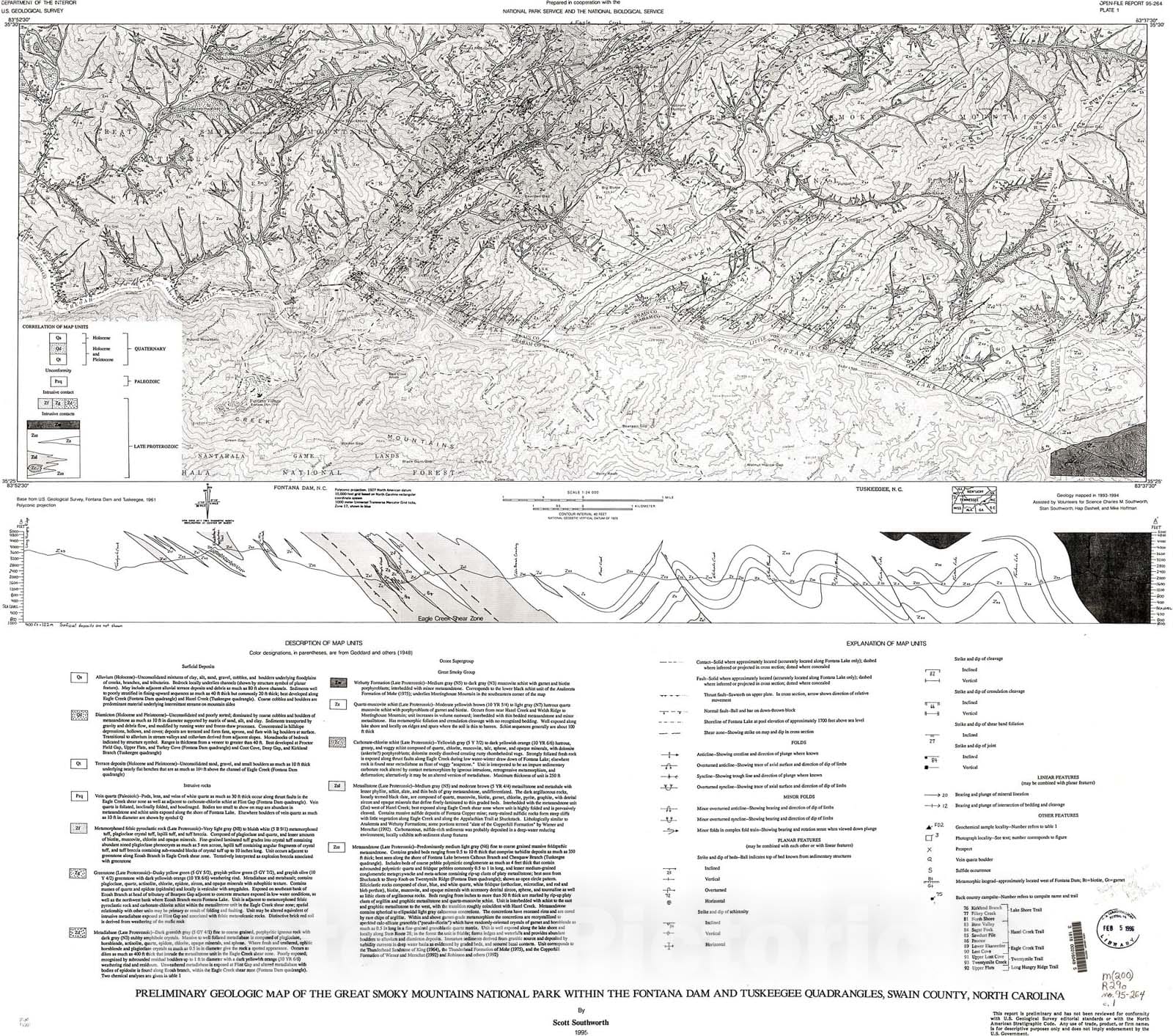 Map : Preliminary geologic map of the Great Smoky Mountains National Park within the Fontana Dam and Tuskeegee quadrangles, Swain County, North Carolina, 1995 Cartography Wall Art :