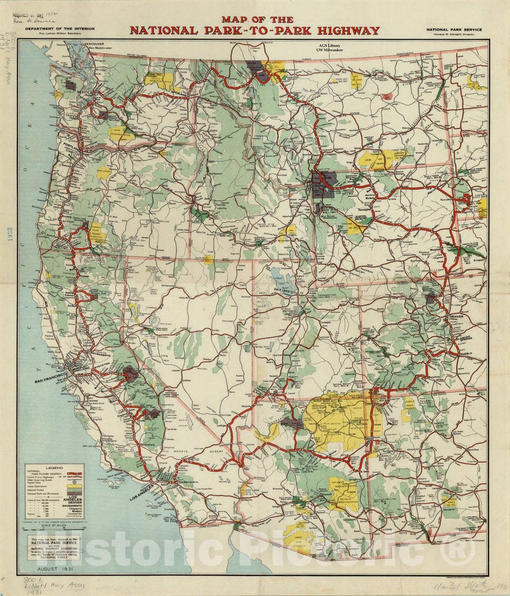Map : United States 1931, Map of the national park-to-park highway, Antique Vintage Reproduction