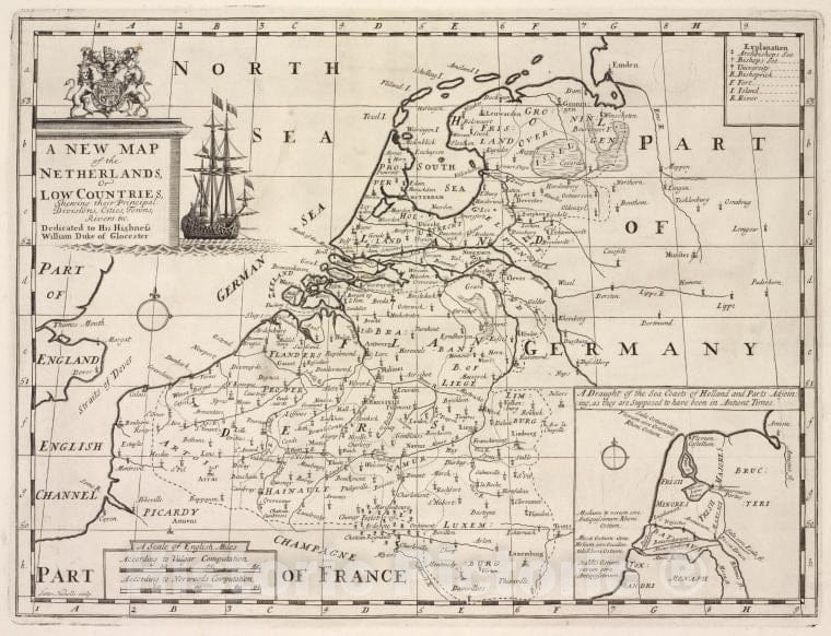 • .Historic 1700 Map - A New Map Of The Netherlands Or Low Countries, Shewing Their Principal Divisions, Cities, Towns, Rivers &C. - England - Vintage Wall Art
