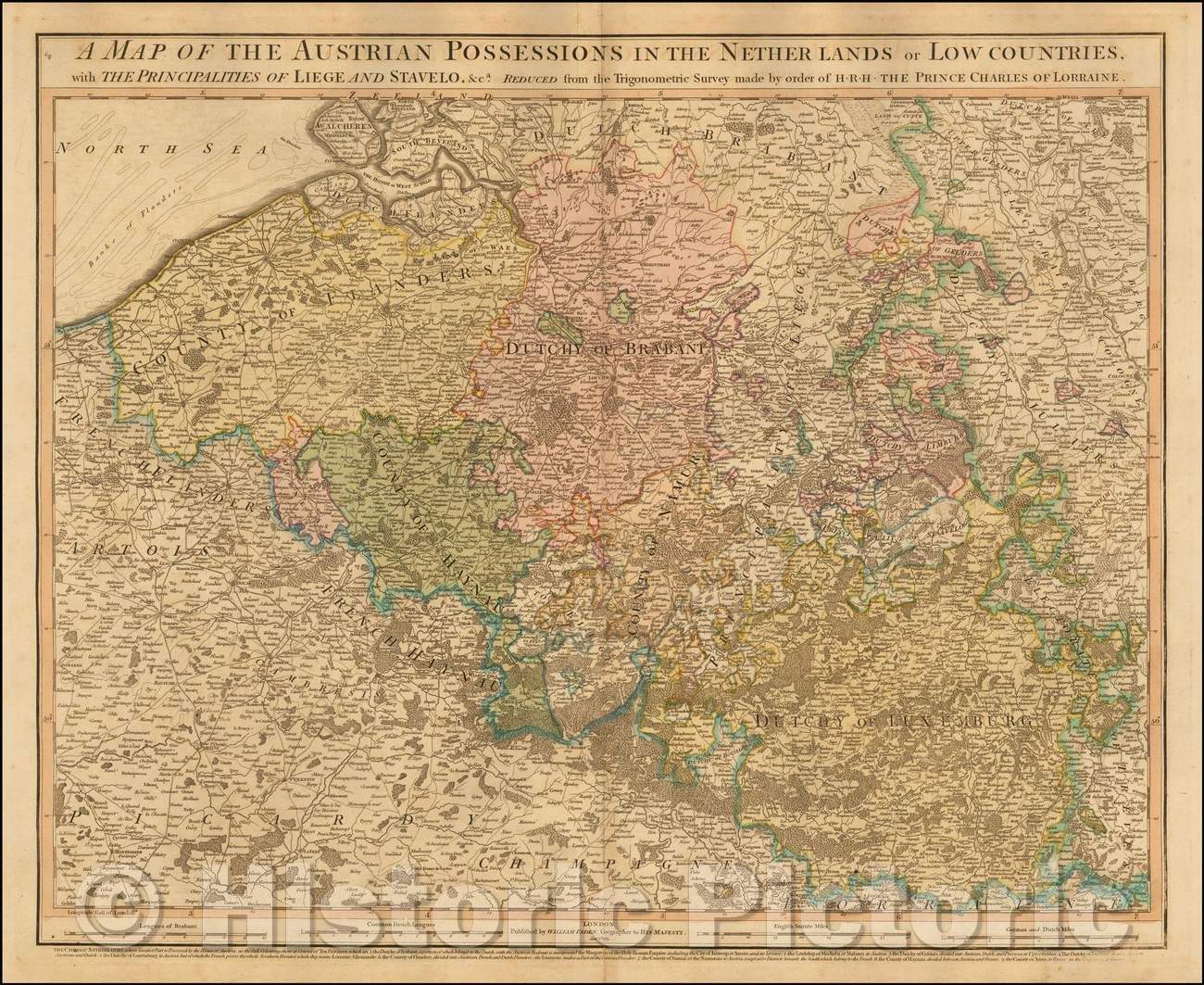 • .Historic Map - Austrian Possessions in the Netherlands or Low Countries, with the Principalities of Liege and Satvelo &ca, 1799, William Faden - Vintage Wall Art