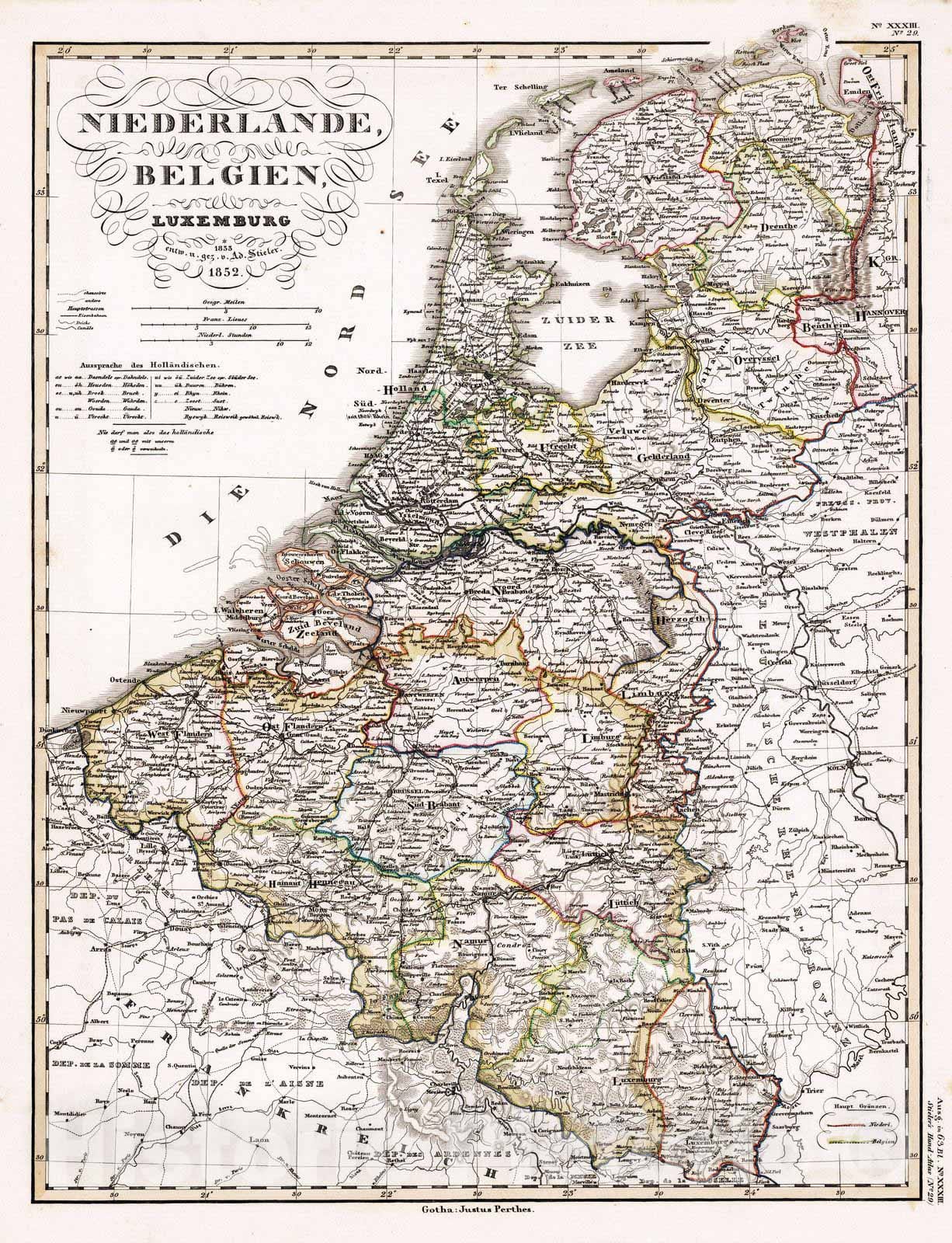 Historic Map : Belgium, 1852 Niederlande, Belgien, Luxemburg. (Netherlands, Belgium, Luxemburg). , Vintage Wall Art
