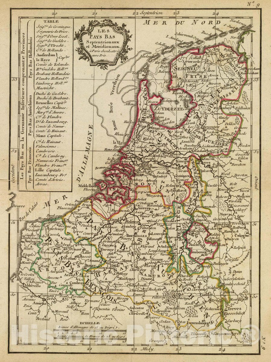 Historic Map : Belgium; Netherlands, Benelux countries Les Pays Bas Septentrionaux et Meridionaux. A Paris, Chez Lattre, avec priv. (ca. 1800), 1800 Atlas , Vintage Wall Art