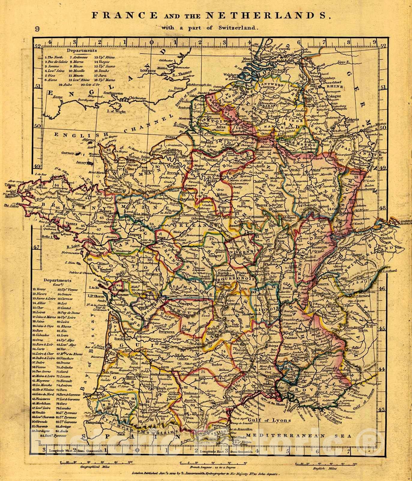 Historic Map : France and the Netherlands 1828 Hand Colored Cartographer: A Arrowsmith : Atlas of Ancient and Modern Geography : Vintage Wall Art