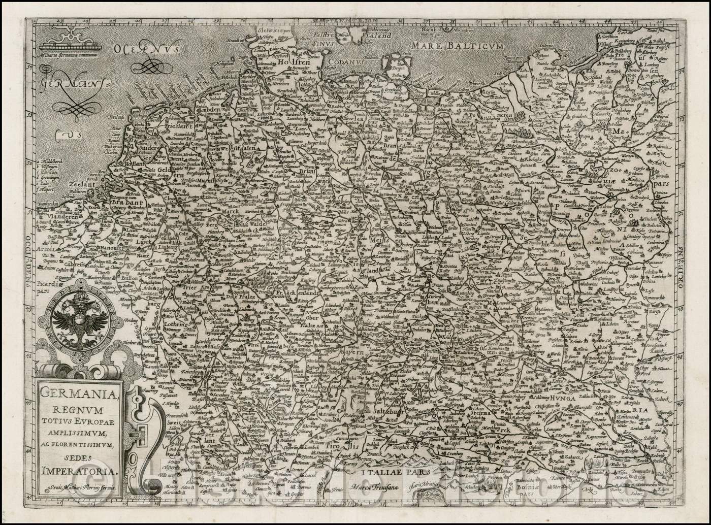 • .Historic Map - Germania, Regnum Totius Europae Amplissimum Ac Florentissmum Sedes Imperatoria :: Florimi of Northern Europe, Belgium and The Netherlands, 1595 - Vintage Wall Art