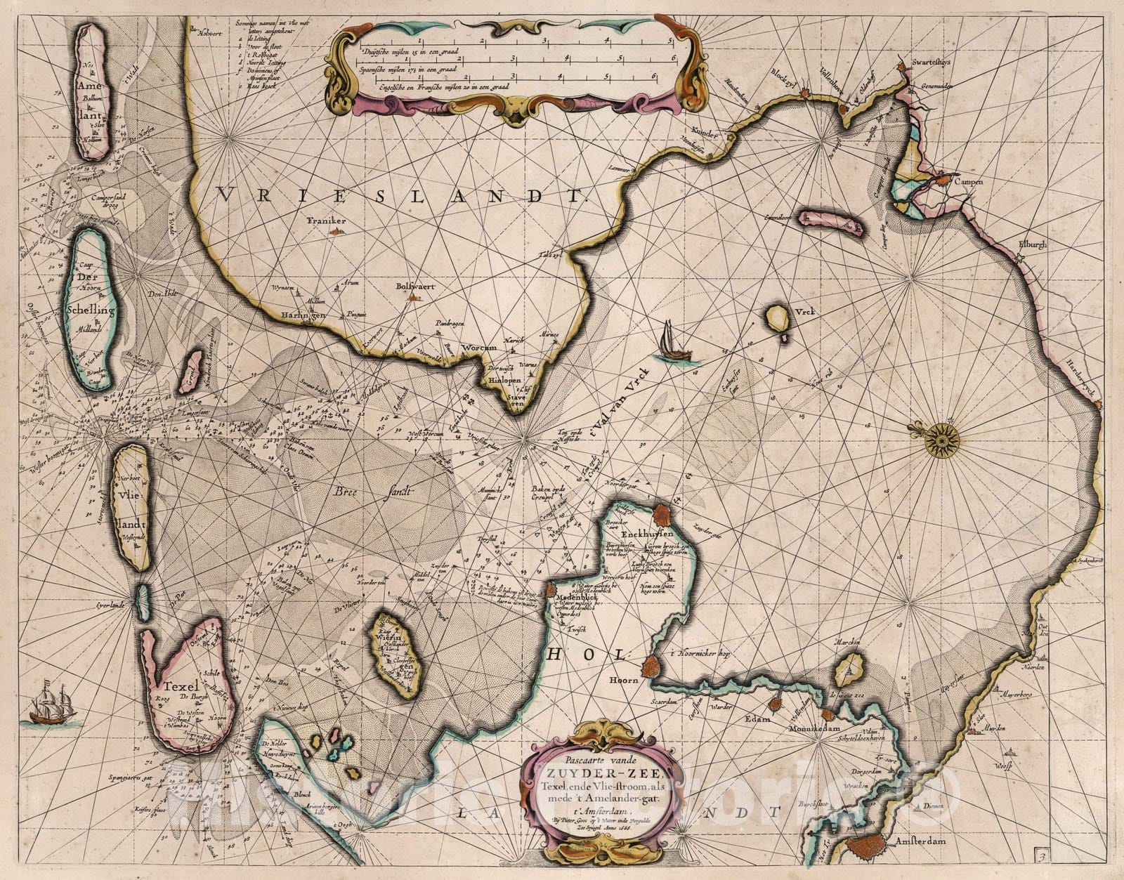 Markermeer (Netherlands) 1666 Pascaarte van de Zuyder-Zee. , Vintage Wall Art