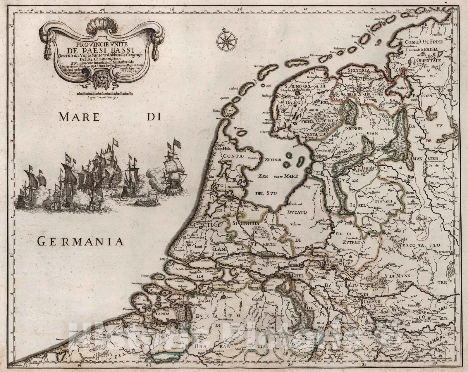 Provincie Vnite de Paesi Bassi : descritte da Nicolo Sansone d'Abbeuille ... e nouamente intagliate da Gio. Batt.a Falda e stampate con diligenza e cura da Gio. Giacomo Rossi in Roma alle Pace con licenza de superiori e priuilegio l'An. 1702. (to accompany) Mercurio Geografico overo Guida Geografica in tutte le parti del Mondo ... Tomo Primo. (Map 44). | A fine example of De Rossi's atlas, in 2 volumes, similar to Coronelli's atlas of the same period, with engraved decorative title page. Includes 150 engraved outline hand colored maps with decorative title cartouche, on 181 sheets. Some maps having 2-4 page numbers. Index includes plates 1-95 of the first volume, and plates 96-181 in the second volume. Maps dated between 1669 and 1715, issued by Giov. Giac. de Rossi and Domenico de Rossi, they are mainly derived from Cantelli da Vignola's maps, an important seventeenth-century cartographer who pioneered the Italian style of fine bold engraving that would eventually be embraced and expanded upon by Vincenzo Coronelli, and Nicolas Sanson (20 December 1600 ' 7 July 1667) a French cartographer, termed by some the creator of French geography. Maps engraved by Baudrand, Franciscus Donia, G.B. Falda, Jean Lhuilier, Vin Mariotti, Gasparo Pietro Santa, Salomon Rogiers, & Giorgio Widman, Lubin, Titi, Ameti, Magini and Mattei. Bound in blue half leather binding. Giovanni Giacomo De Rossi (1627 - 1691) was an Italian printer and publisher active in 17th century Rome. Giovanni inherited the important Rome based printing business originally founded by his father, Giuseppe de Rossi (1570-1639). By the mid-17th century the Rossi firm was considered the most active and important press in Rome.