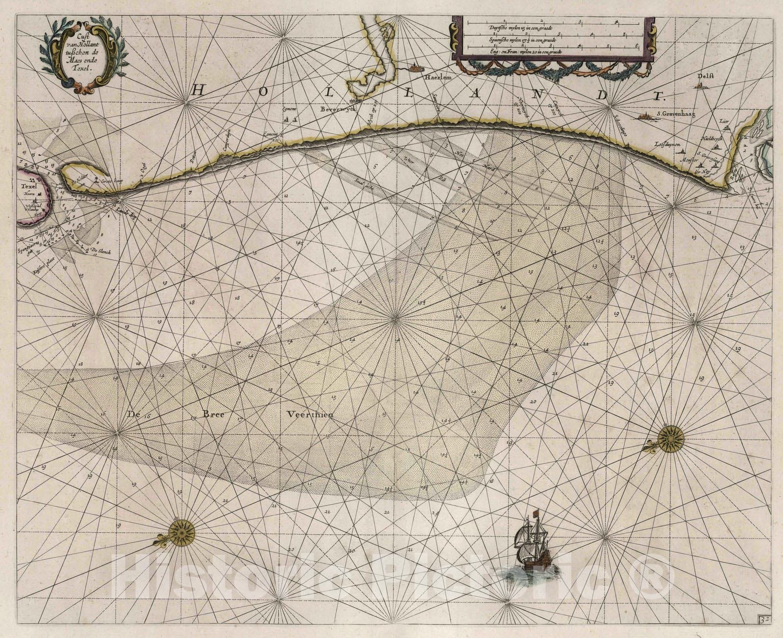 Historic Map : Netherlands, North Sea 1667 Cust van Hollant tusschen de Maes ende Texel. , Vintage Wall Art