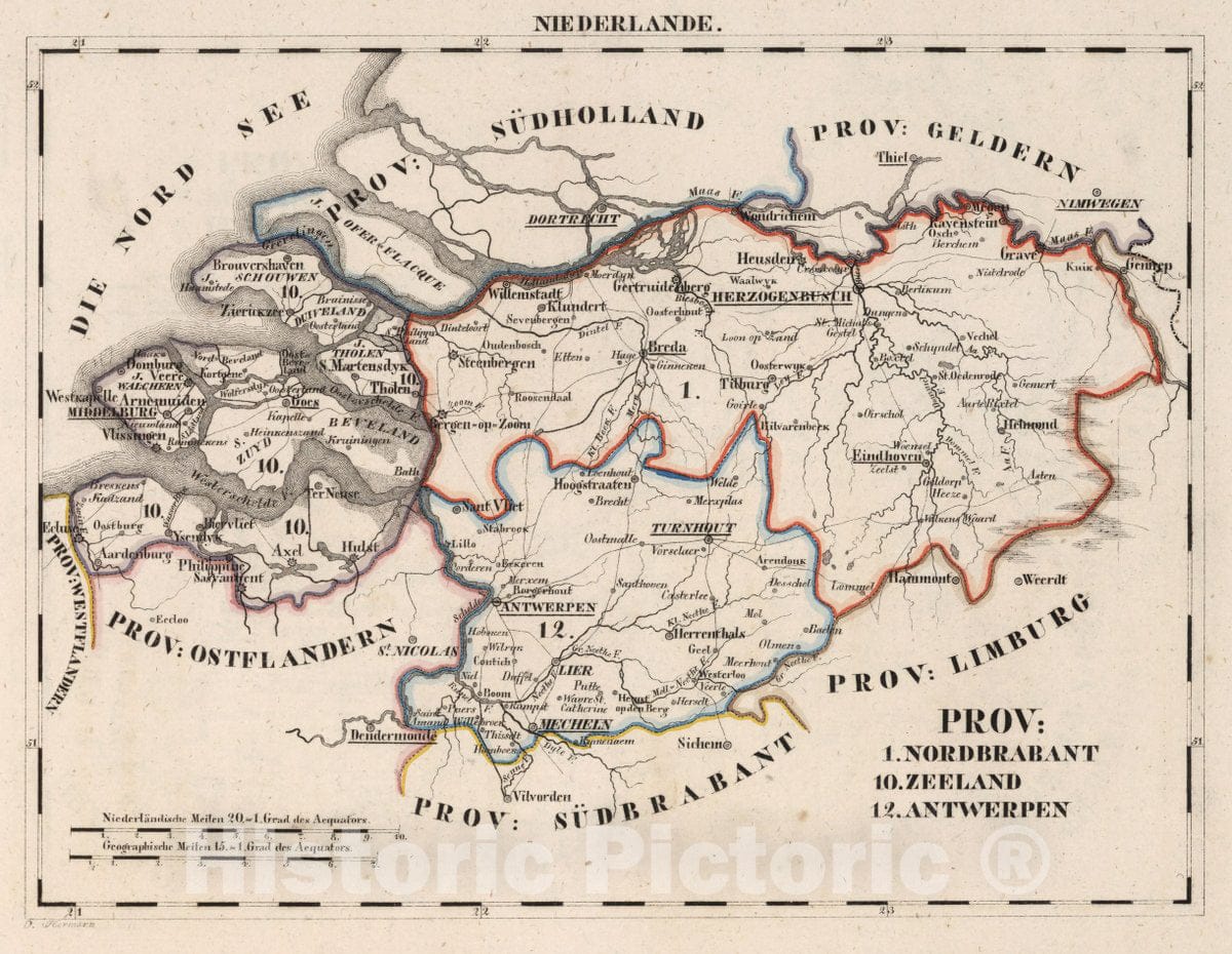 Historic Map : Netherlands, V.1:1-5: V:1. Niederlande: Prov: 1. Norderabant. 10. Zeeland. 12. Antwerpen, 1825 Atlas , Vintage Wall Art