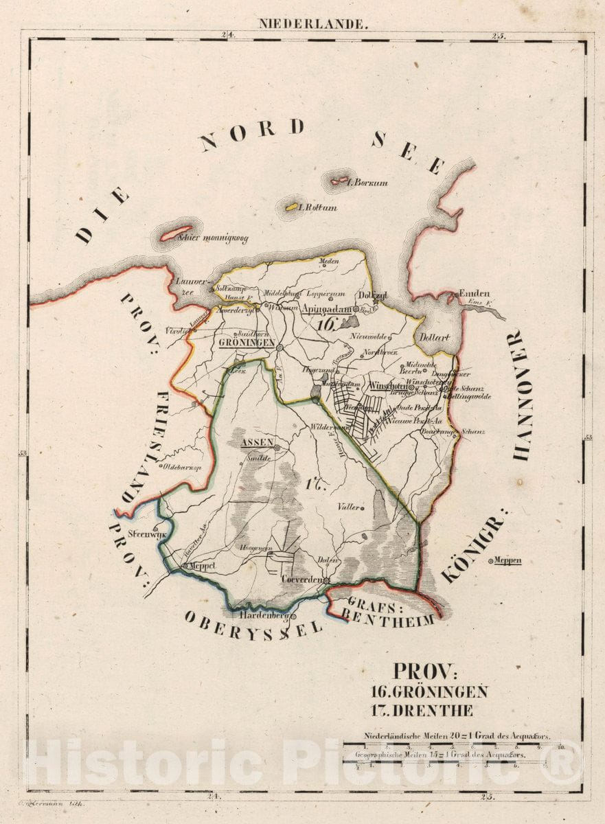 Historic Map : Netherlands, V.1:1-5: V:1. Niederlande: Prov: 16. Groningen. 17. Drenthe, 1825 Atlas , Vintage Wall Art