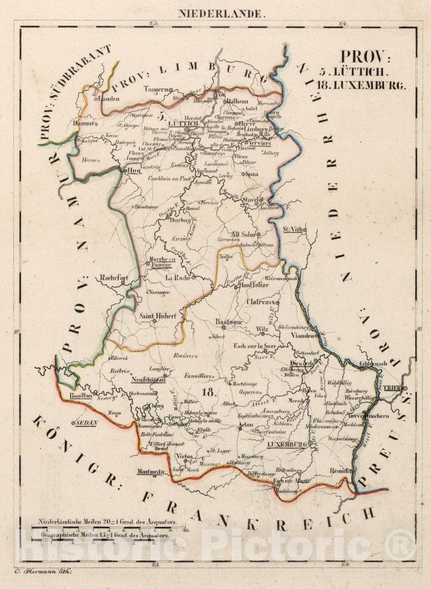 Niederlande: Prov: 5. Luttich. 18. Luxemburg. O. Hermann, Lith. (to accompany) Atlas von Europa nebst den Kolonien : Funfte Lieferung. Die Konigreich: 1. Niederlande, 2. Danemark, und, 3. Schweden mit Norwegen. | Atlas von Europa nebst den Kolonien : fur Geschaftsmanner, Zeitungsleser und Besitzer des Conversations-Lexicons in einer Folge von Charten und einem alphabetisch eingerichteten Texte : bearbeitet von W. E. A. v. Schlieben ... Leipzig bei Georg Joachim Goschen 1825. O. Hermann, Lith. | Publisher:Georg Joachim Goschen