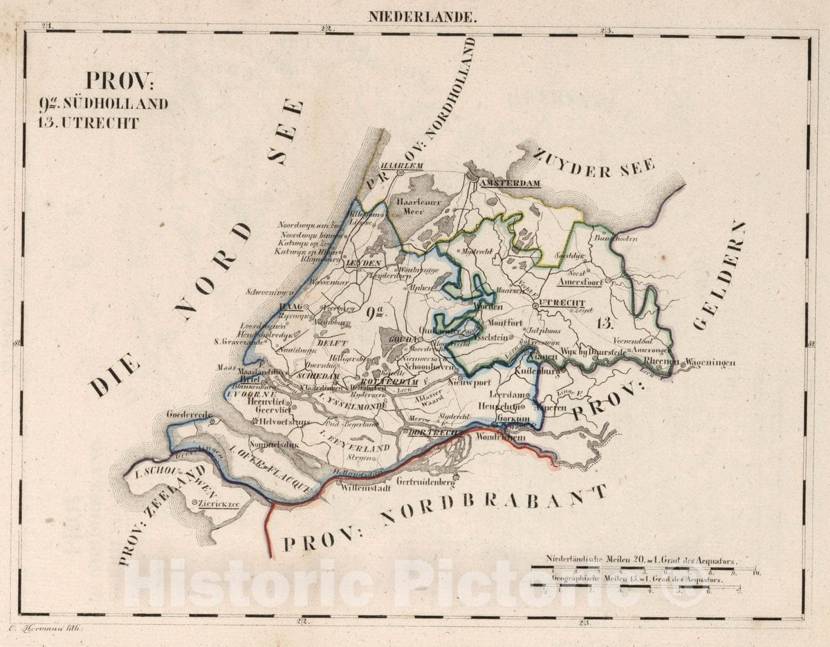 Historic Map : Netherlands, V.1:1-5: V:1. Niederlande: Prov: 9a. Sudholland. 13. Utrecht, 1825 Atlas , Vintage Wall Art