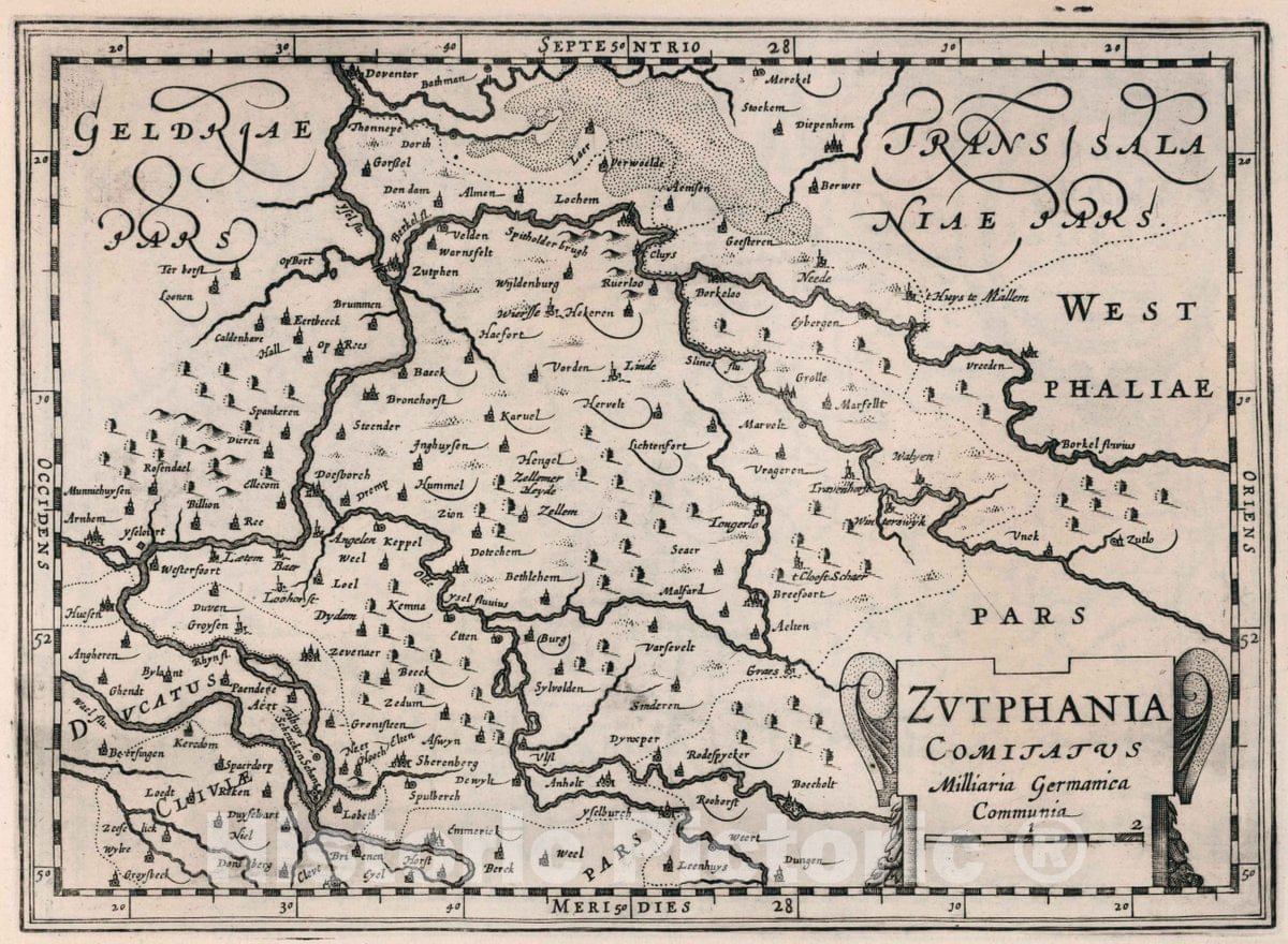 Historic Map : Netherlands, Zvtphania Comitatus. Atlas sive Cosmographicae Meditationes de Fabrica Mundi et fabricati Figura, 1636 Atlas , Vintage Wall Art
