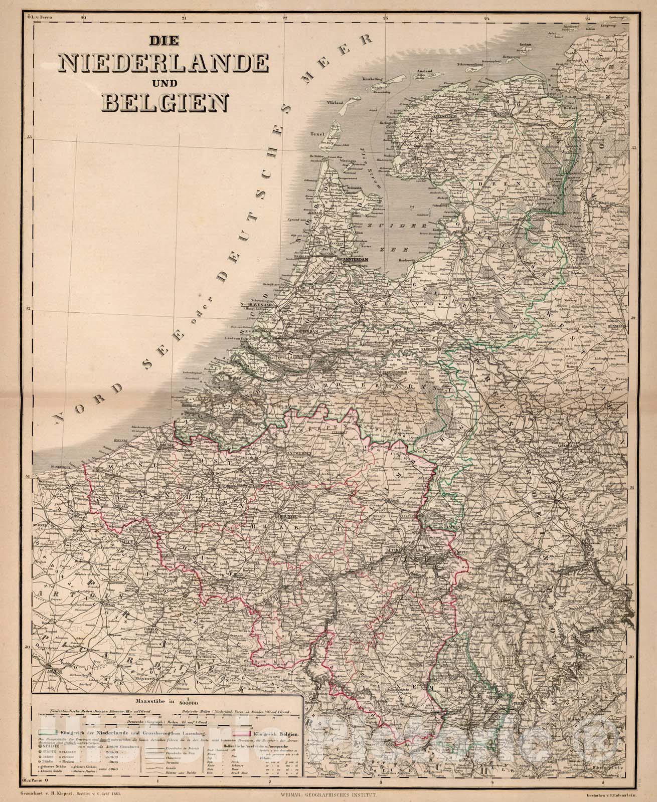 Die Niederlande und Belgien. Gezeichnet v. H. Kiepert. Revidirt v. C. Graf 1865. Gestochen v. F. Eulenstein. Weimar: Geographisches Institut. (to accompany) Hand - Atlas Der Erde Und Des Himmels. | Hand - Atlas Der Erde Und Des Himmels. In siebzig Blattern. Zweiundvierzigste Auflage. Bearbeitet Von Dr. H. Kiepert, C. Graf, A. Graf Und Dr. C. Bruhns. Weimar, Geographisches Institut. | This 42nd edition is the first one in Which the brothers Carl and Adolf Graef are mentioned as the authors. Maps by H. Kiepert, Graf & Bruhns. Listed in Phillips under Kiepert. Many of the maps are now lithographed, although some are engraved, outline color, 70 � 57 or smaller. Covers are half leather black marbled paper covered boards. The atlas was published in installments, maps are dated from 1856 to 1867. The first map sheets Appeared in 1856. Copies from the years 1857-1860 were supplemented with maps from the 41st edition. The first 2 maps are world maps: the hemispheres and a world map in Mercator's projection. Followed by 3 thematic maps: two physical ones and a sheet of mountain profiles. Next are 2 maps of Europe, 23 maps of Austria and Germany, France printed in 4 sheets, and 19 maps of the other European countries, 5 maps of Asia, 4 of Africa, another 7 of the Americas and 2 of Australia/Oceania. The last 3 maps depict the northern and southern skies and the solar system, thereby justifying the title 'Hand-Atlas der Erde und des Himmels. No year is Mentioned on the title page. The publication year given (1867) is the year of the most recent maps of the atlas. The 42 edition was completed in 1861. In almost all of the years 1862-1869 revised printings of the 42nd edition were published, for example in which the Italian unification has been incorporated. In later printings - after the Austro-Prussian War in 1866 - the maps of Central Europe have a different order, where Germany precedes Austria.
