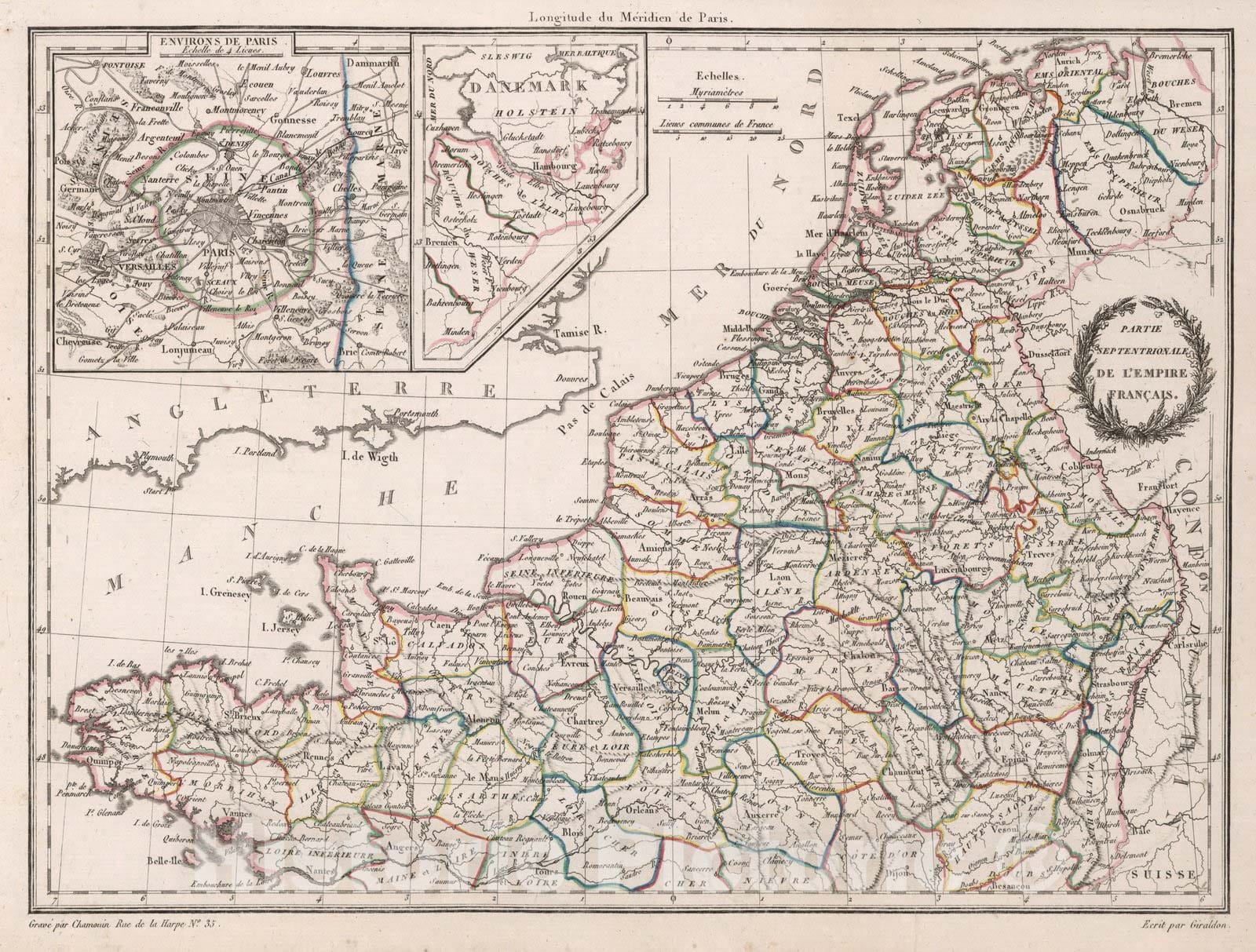 Partie Septentrionale de l'Empire Francais. (insets) Environs de Paris. (Holstein). | Atlas Complet Du Precis De La Geographie Universelle De M. Malte-Brun; Dresse Conformement Au Texte De Cet Ouvrage Et Sous Les Yeux De L'Auteur, Par M. Lapie, Capitaine Ingenieur Geographe. (Cet Atlas est forme de 75 Cartes.) A Paris, Chez Francois Buisson, Libraire-Editeur, Rue Gilles-Coeur, No. 10. 1812. | These maps have beautiful cartouches and hand painted outline color. Lapie made the maps. 1st edition. This atlas is up to date: the North America map shows the Lewis and Clark information and Lewis and Clark are discussed in the text explaining the map. In French. Relief shown in hachures or sketches. Extraordinary unique vignettes used for framing the title of each map.