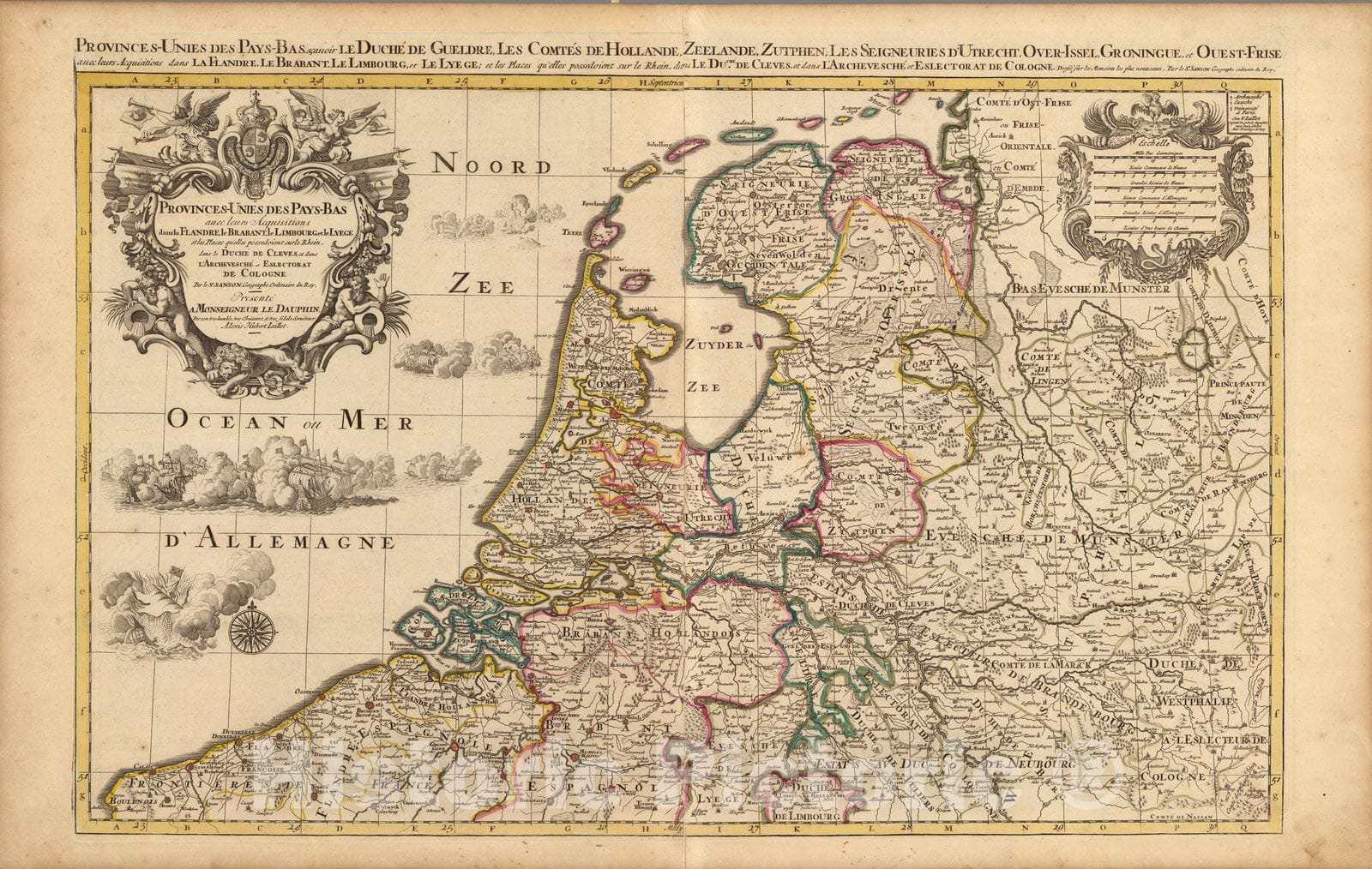 Provinces-Unies des Pays-Bas. | Atlas Nouveau Contenant Toutes Les Parties du Monde, ou Sont exactement Remarques Les Empires, Monarchies, Royaumes, Estats, Republiques & Peuples qui fy trouuent a present. Par le Sr. Sanson, Geographe ordinaire du Roy. Presente a Monseigeur le Dauphin ... Hubert Jaillot Geographe du Roy. A Paris, Chez Hubert Jaillot .... | This issue of the Mortier/Jaillot Atlas Nouveau has 169 maps (1 more than the normal count of 168) plus diagrams, text pages, decorated titles and index pages. It is noted for the large number of multi-sheet "Theatre de la Guerre" (Theater of War) maps covering the battles raging in Europe and the Americas during the Spanish War of Succession (1701-1713) and the Northern War (1700-1721). The Atlas Nouveaux was first published by Jaillot in Paris in 1681(46 maps) with later issues by him in 1684 (72 maps) and 1689 (80 maps). In 1692 Pierre Mortier published his first edition of the Jaillot atlas with 99 maps, another edition followed in 1696 with 111 maps. In 1707/1708 Mortier issued our edition with 168 maps. Later editions by Mortier expanded the atlas even further - 1708, 200 maps; ca 1721, 300 maps; ca 1735, 400 maps. The atlas maps are large folio size with most maps made of two sheets and many maps combining 4 or 6 sheets (those also issued as wall maps separately). The atlas is most impressive for its large size and number of maps as well as being up to date for its time. This copy colored in outline with relief shown pictorially.