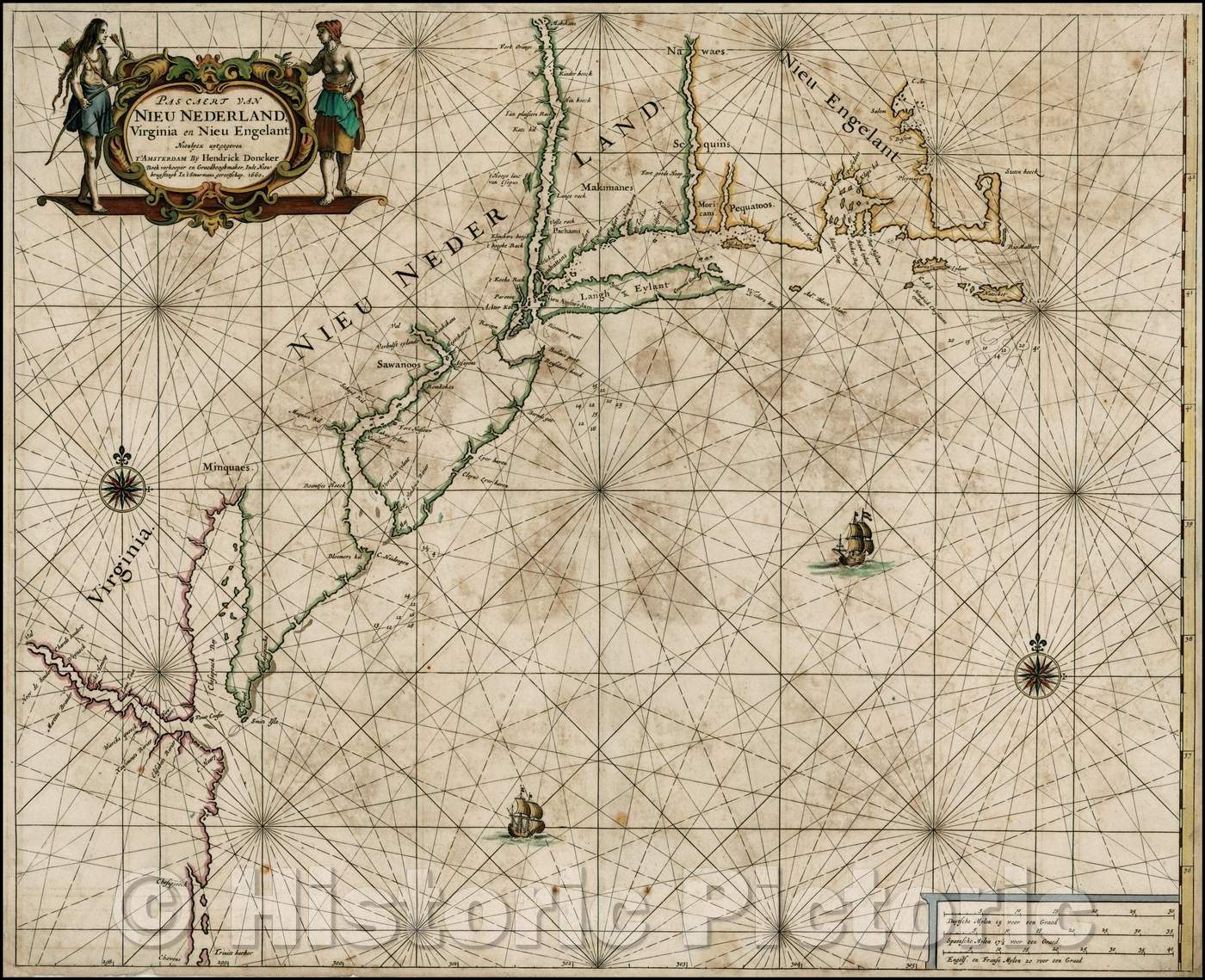 Historic Map - Pascaert van Nieu Nederland, Virginia :: Pascaert Newport Netherlands, Virginia and Newport Engelant Nieulycx uytgegeven, 1660 - Vintage Wall Art