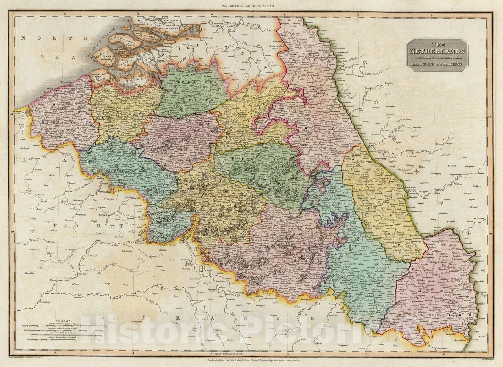 The Netherlands and the countries to the left bank of the Rhine. Drawn under the direction of Mr. Pinkerton by L. Hebert. Neele sculpt. 352 Strand. London: published 1st Septr. 1810 by Cadell & Davies, Strand & Longman, Hurst, Rees, Orme, & Brown, Paternoster Row. | A modern atlas, from the latest and best authorities, exhibiting the various divisions of the world, with its chief empires, kingdoms and states, in sixty maps, carefully reduced from the largest and most authentic sources. Directed and superintended by John Pinkerton, author of Modern geography, &c. London: Printed by T. Bensley, Bolt Court, Fleet Street; for T. Cadell and W. Davies, Strand; and Longman, Hurst, Rees, Orme, And Brown, Paternoster Row. 1815. | A superb copy. One of the best English Atlases of the period, similar to Thomson's General Atlas of 1817. See the Philadelphia edition of 1818. Maps are hand painted in full color and bound in new half leather beige cloth covered boards with "Pinkerton Atlas" stamped in gilt on a black spine label.