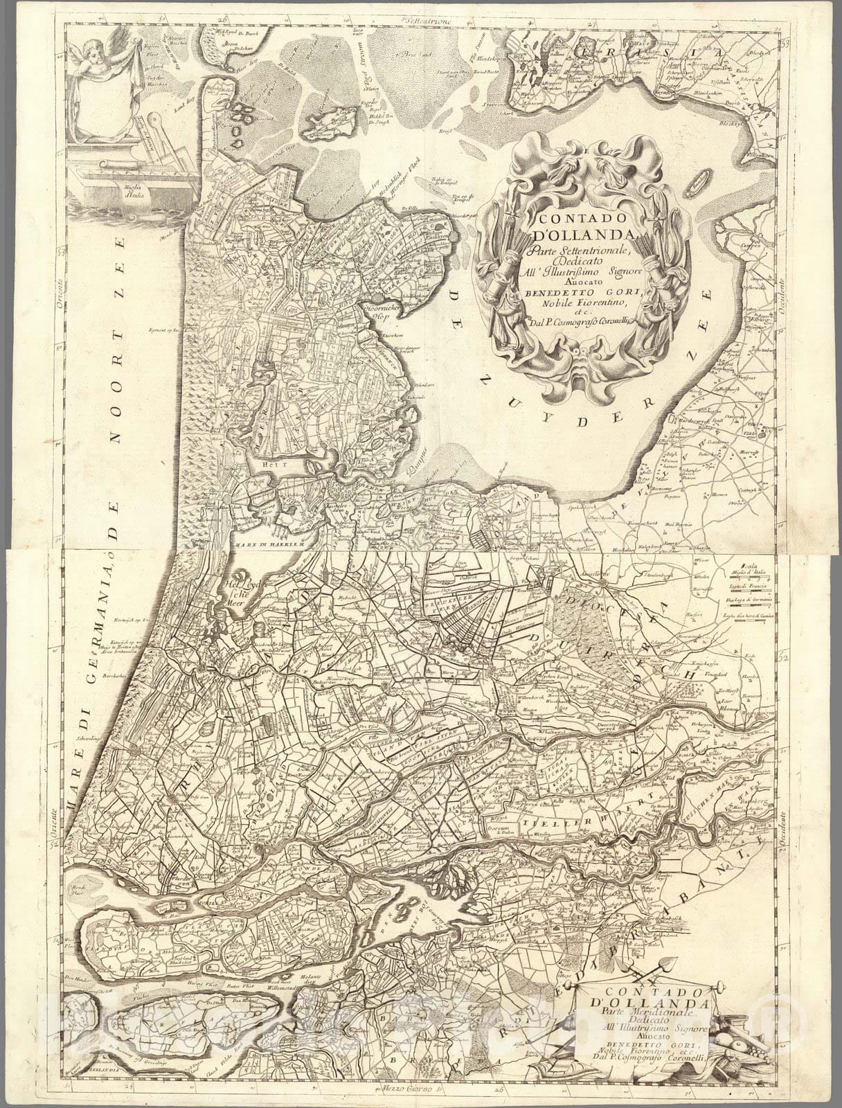 (Composite to) Contado d'Ollanda parte settentrionale. Contado D'Ollanda Parte Meridionale. (to accompany) Isolario descrittione geografico-historica, sacro-profana, antico-moderna ... e in supplimento dei XIV volumi del Bleau. Tomo II dell' Atlante veneto. Opera, e Studio del P. Maestro Vincenzo Coronelli ... A Spese dell Auttore MDCLXXXXVI. | Coronelli's Isolario Atlante Veneto, (1691-1692; 1696-98), in 2 volumes in 2 parts. This is the second part of volume 2. The first part of volume 2 covers the Mediterranean, Italy and the Adriatic; the second (this copy), covers Britain and Europe, Africa, Japan and Asia, and the West Indies. Each volume with engraved titles, half-titles, titles of Isolario, engraved architectural frontispieces, portraits, views, charts, text and 24 engraved maps, using the latest geographical information available. Many of the more important maps were engraved on two sheets, to allow greater detail. Coronelli's Isolario is considered to be one of the most decorative atlases of 17th century. Illustrated in Coronelli's unique style, it is a comprehensive survey of the islands of the world as known in his time, along with diagrams of various nautical weather conditions, instruments, fortresses and ship diagrams. Collation of Coronelli's atlases varies greatly; this copy is complete, but we have seen other copies with more maps and globe gores added. Coronelli, an Italian theologian, cartographer and geographer, was author or contributor to over 140 titles and produced several hundred maps, either printed separately or as parts of atlases.