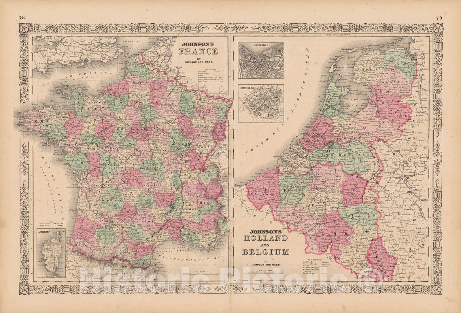 • .Historic Map : France & Netherlands & Belgium 1865 , Johnson's Family Atlas , Vintage Wall Art