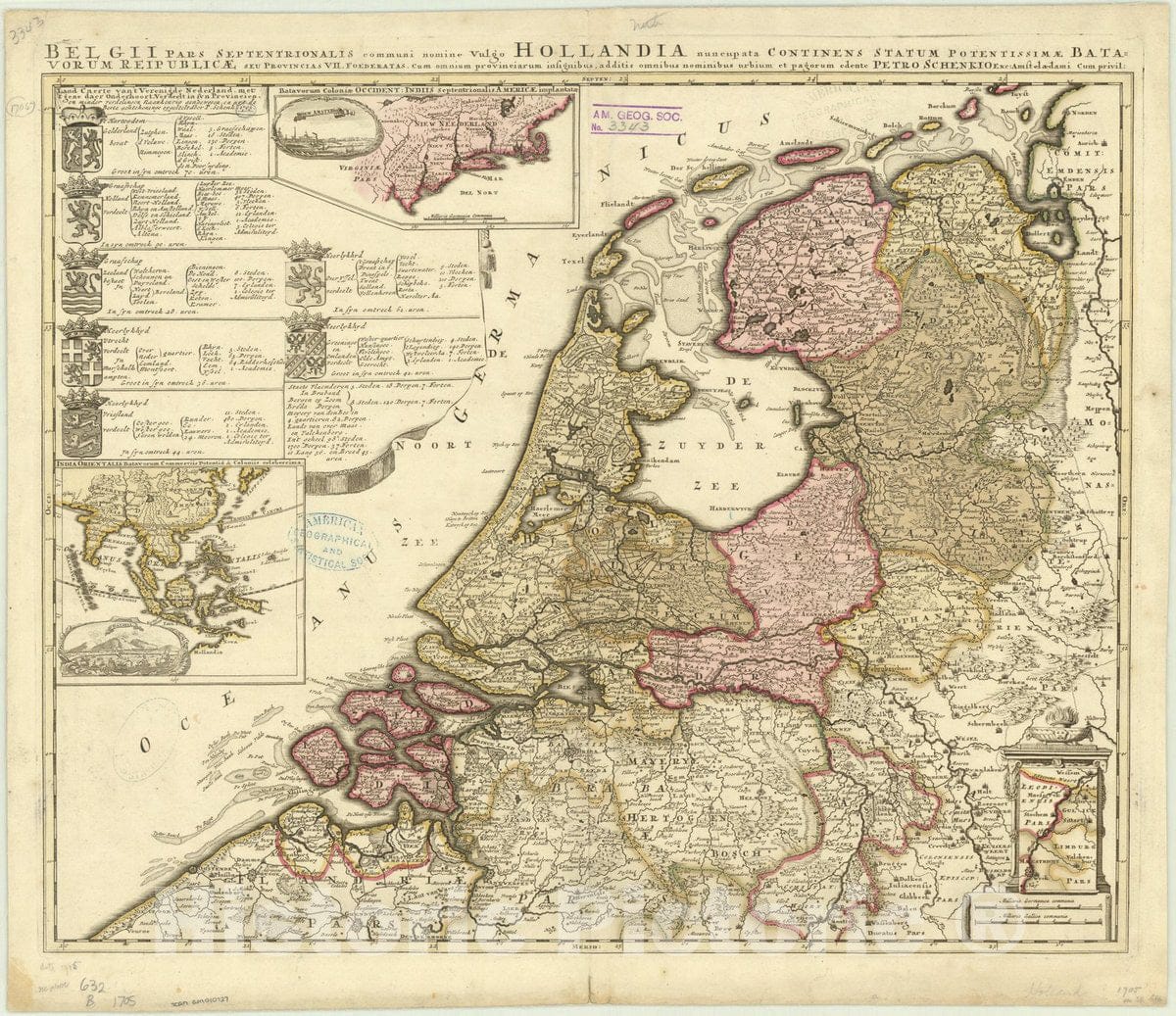 Belgii pars septentrionalis communi nomine vulgo Hollandia : nuncupata continens statum potentissimae Batavorum Reipublicae seu provincias VII foederatas cum omnium provinciarum insignibus additis omnibus nominibus urbium et pagorum / edente Petro Sche