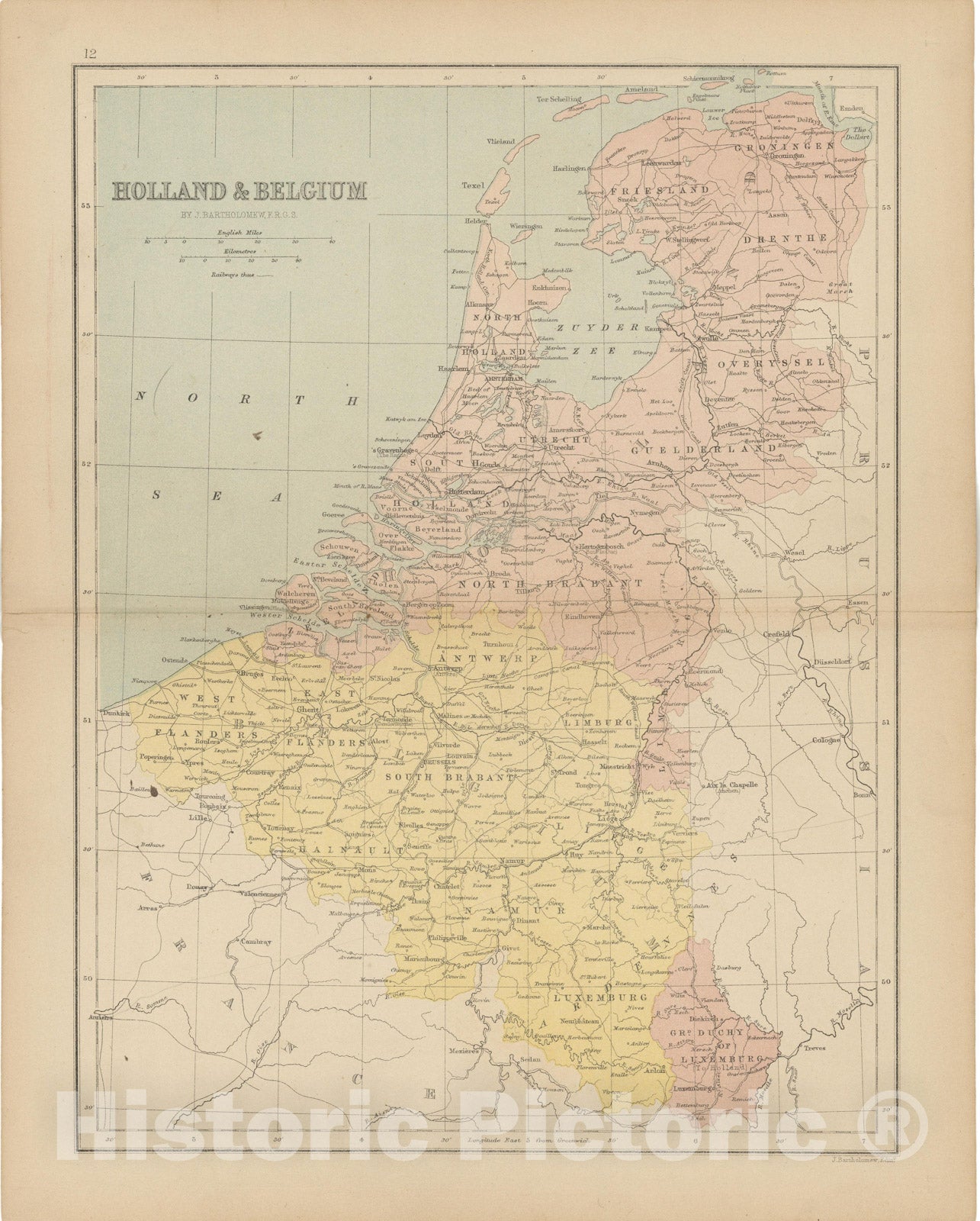 • .Historic Map : Netherlands & Belgium 1875 , Student Atlas of Modern Geography , Vintage Wall Art
