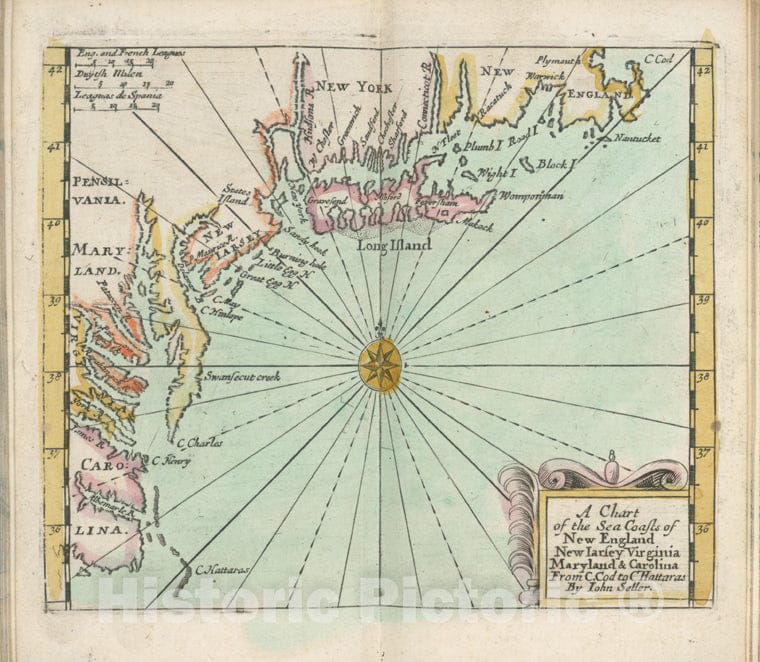 Historic 1682 Map - A Chart Of The Sea Coasts Of New England, New Iarsey, Virginia, Vintage Wall Art